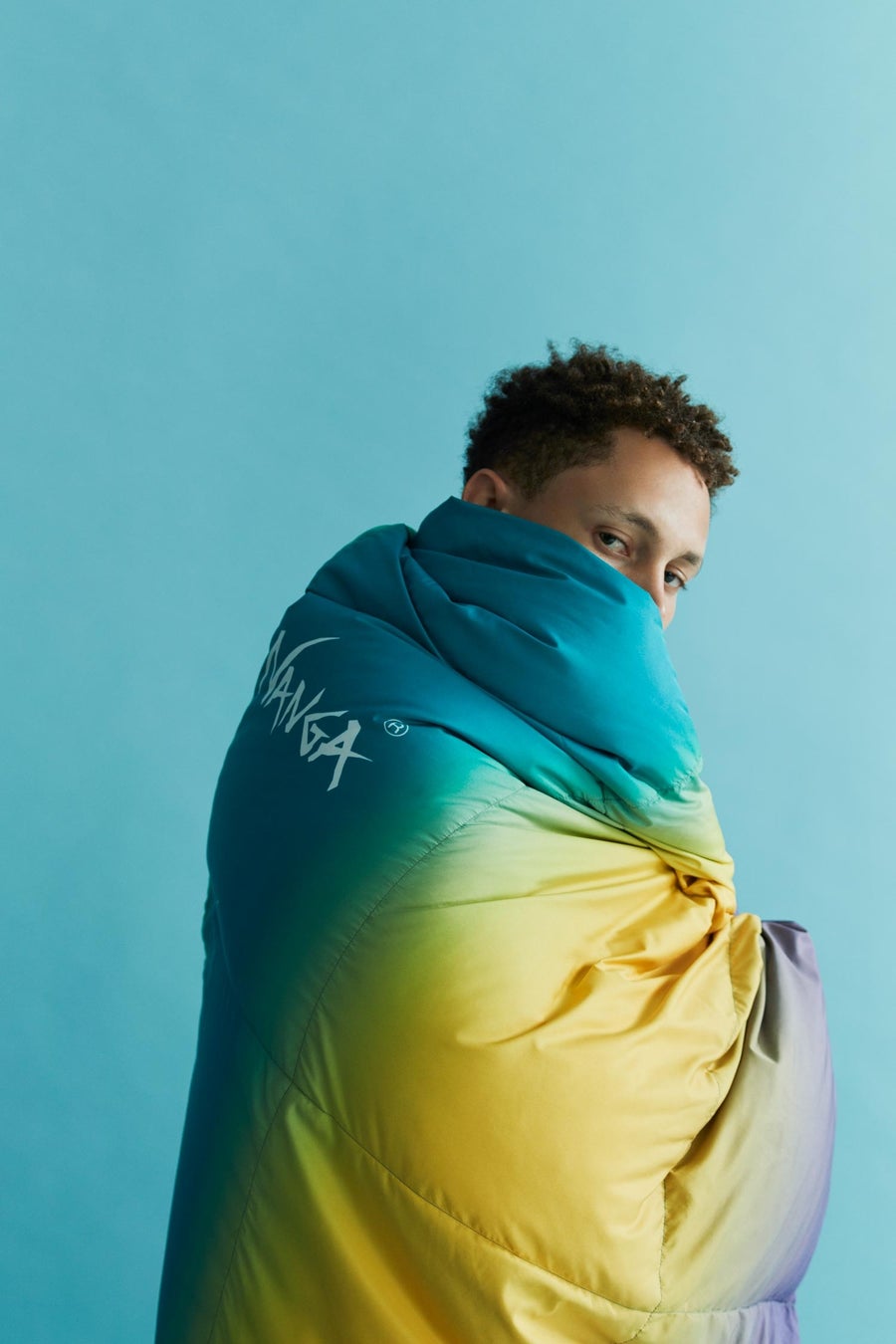 洗濯速乾性に優るポリエステル生地に、たっぷり300gのダウンを封入。デュベとコットンブランケットの中間的アイテムで、就寝環境の調整にフレキシブルに使用可能。カラーは抽象的なグラデーション。生地の表面には肌触りの良いピーチスキン加工を施しました。