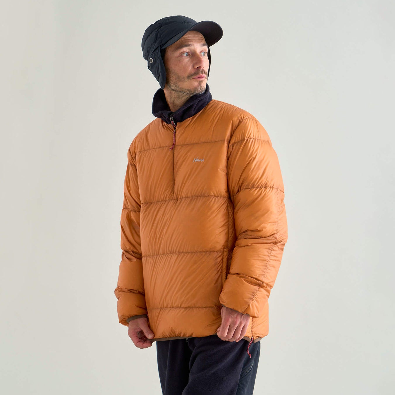 汎用性の高いクルーネックのダウントップス。フロントは温度調整・着脱がしやすいハーフジップで、前見頃の両サイドにはファスナー開閉のポケットを搭載。無駄を省いたシンプル構造で軽量化を図り、内ポケットに全体を収納できるパッカブル仕様を実現しました。