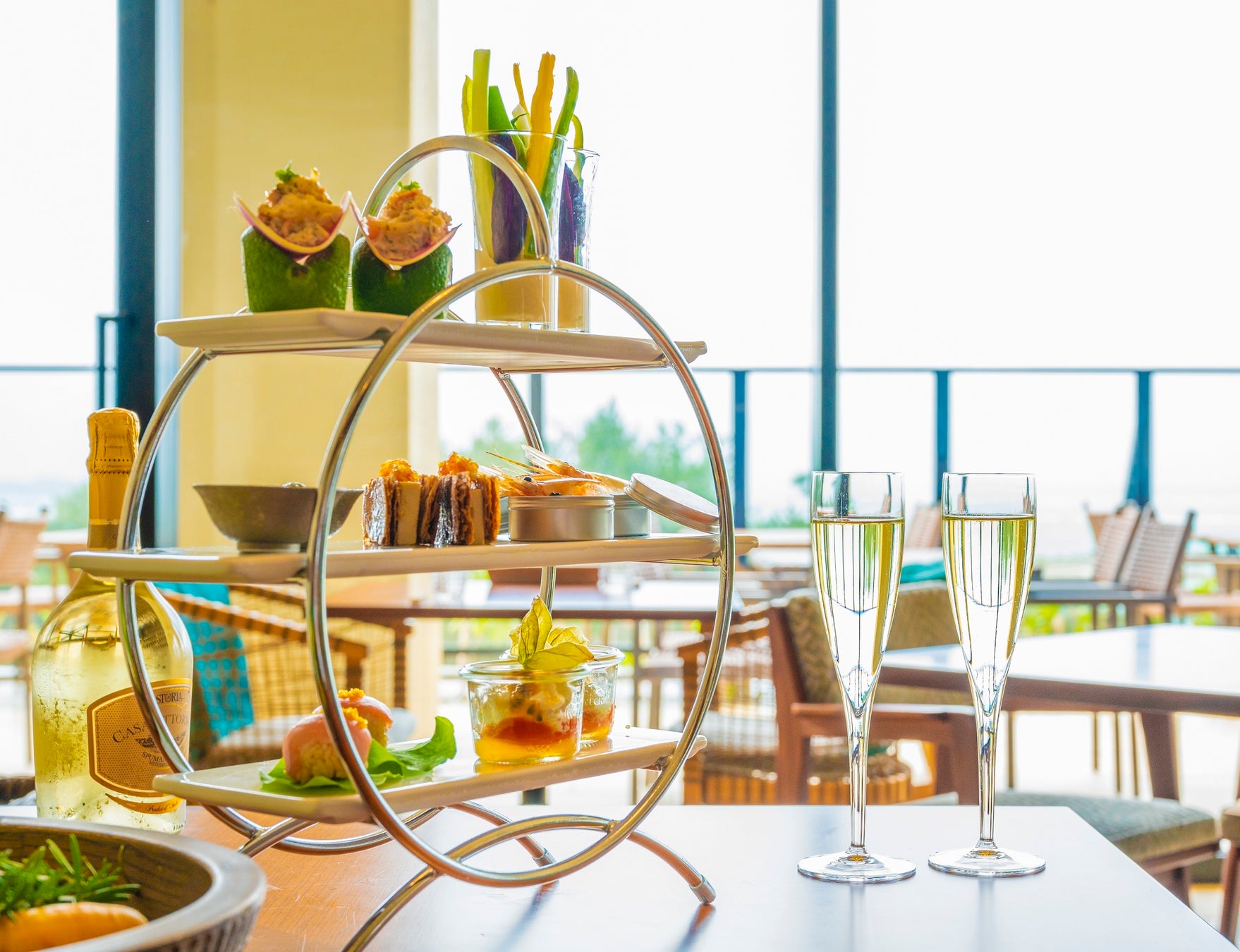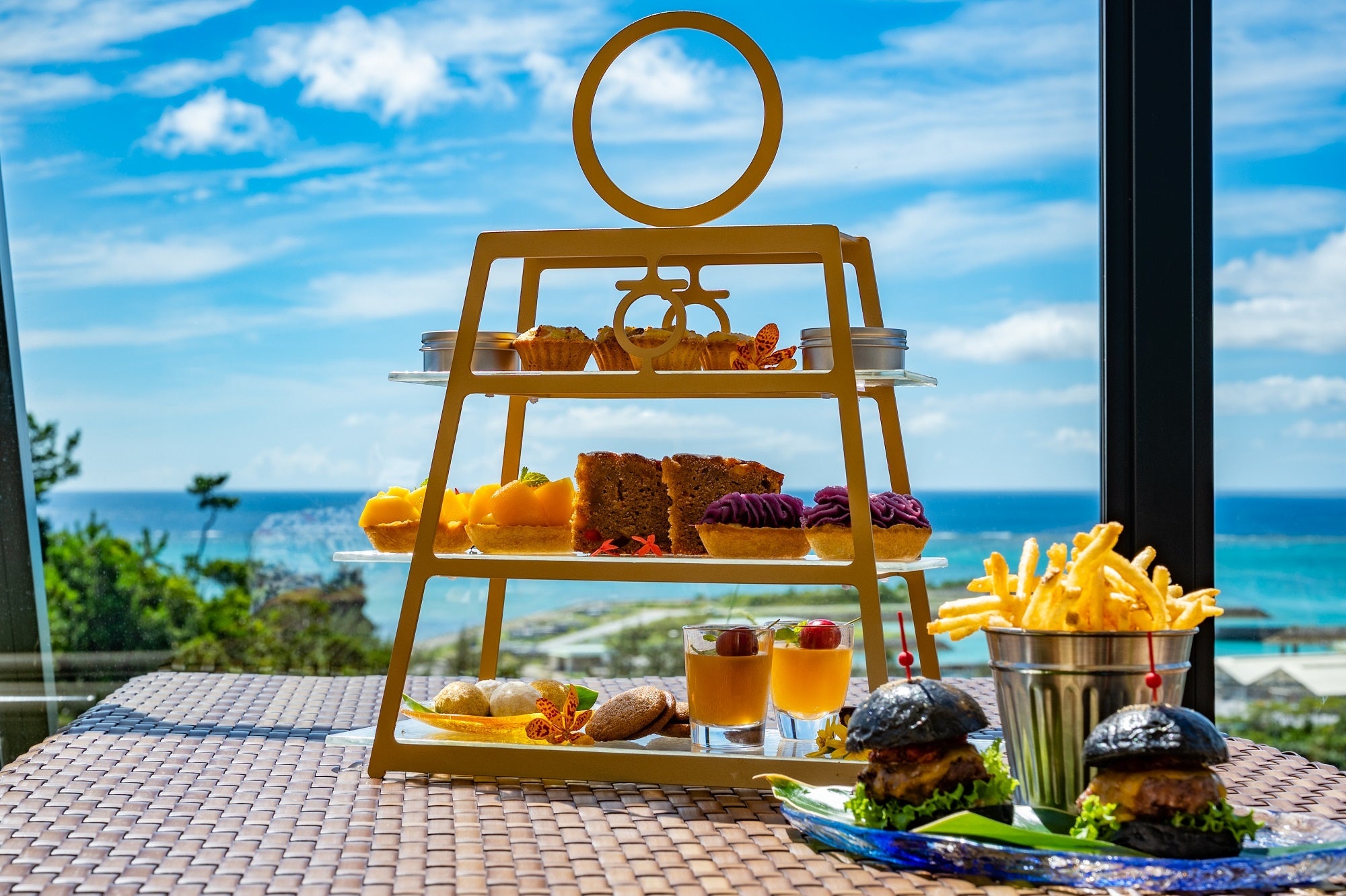 青い海を眺めながら沖縄で採れた素材をふんだんに使用した琉球アフタヌーンティーはいかがでしょうか?伝統菓子をイメージしたデザートとセイボリーに、沖縄ティーファクトリーの琉球紅茶をご用意。美しいロケーションで贅沢なひとときをお楽しみください。
