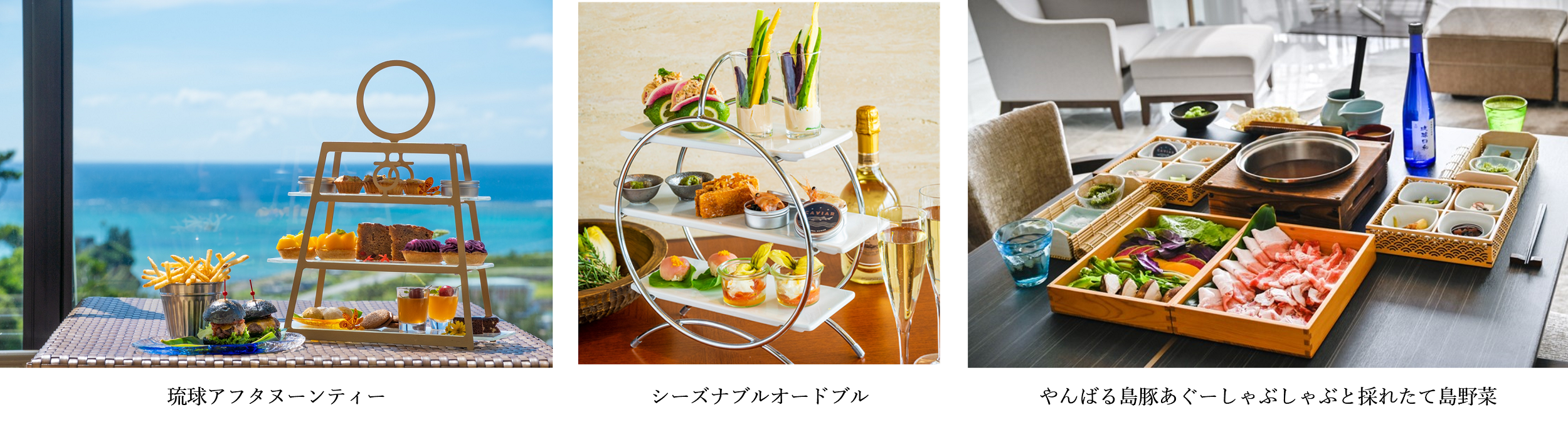 「琉球アフタヌーンティー」は、沖縄で採れた素材を使用し、伝統菓子をイメージしたデザートと、ヒルサイドグリルレストランならではのセイボリー*を楽しむことができ、女子旅にも最適です。また、恩納村ならではの素材を使用した「シーズナブルオードブル」は、スパークリングワインを傾けながら、ゆったりとした贅沢な時間を楽しんでいただけるよう一つ一つこだわったオードブルをご用意いたしました。そして、「やんばる島豚あぐーしゃぶしゃぶと採れたて島野菜」は、恩納村で育てられた新鮮な島野菜とともに、柔らかな口当たりとしっかりとした甘みが特長のやんばる島豚あぐーの旨味をご堪能いただけます。
