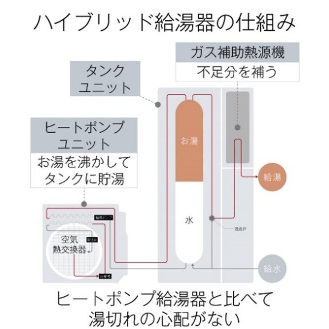 ハイブリッド給湯器は、電気ヒートポンプとガス給湯器を組み合わせ、優れた省エネ性能を発揮する家庭用給湯・暖房システムです。タンクユニットには、通常時、ヒートポンプユニットで大気中の熱を活用して加熱した必要最低限のお湯を貯めていますが、タンク内のお湯がなくなった場合は、ガス補助熱源機に運転を切り替えて必要なお湯を瞬時に供給することが可能です。ヒートポンプ給湯器に比べて“湯切れの心配がない”点が特長です。