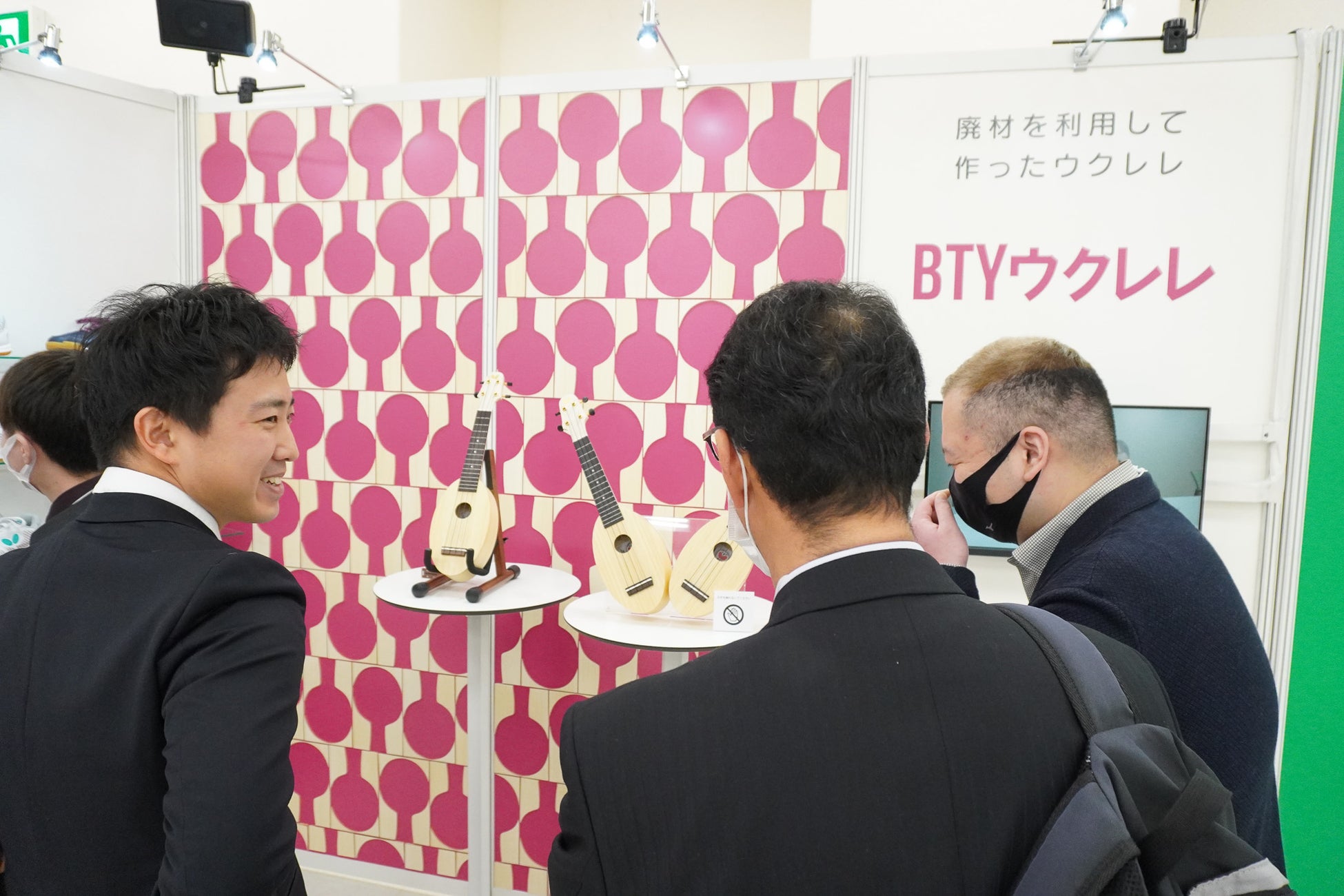 バタフライは三ッ葉楽器株式会社と共同で、卓球ラケットの木材を使用したオリジナル ウクレレを制作いたしました。3月12~13日に開催した「バタフライ ブランド フェア 2024 スプリング」では、卓球ラケットやアパレルなどの新製品に並び、バタフライ オリジナル ウクレレが展示され、ご来場の皆さまからは「どんな音なのか興味がわきますね」「ラケットの材料で楽器ができるなんて驚きです」などの声をいただき、会場内でも注目を集めました。ご来場された希望者の方には、後日寄贈を予定しています。