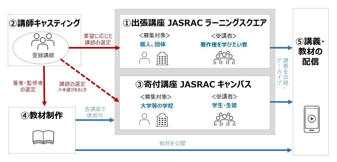 「出張講座JASRACラーニングスクエア」および「寄付講座JASRACキャンパス」の教材として、著作権制度や著作権の集中管理の仕組み、JASRACの業務についてまとめたテキストを制作します。