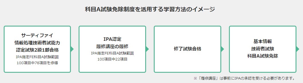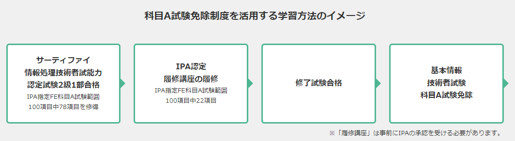 「基本情報技術者試験」の科目A試験免除制度(以下、FE科目A免除制度)は、IPAの認定を受けたカリキュラムに基づき実施される講座を受講し、かつ「修了試験」に合格することで、免除取得から1年間、「基本情報技術者試験」の科目A試験が免除される制度です。