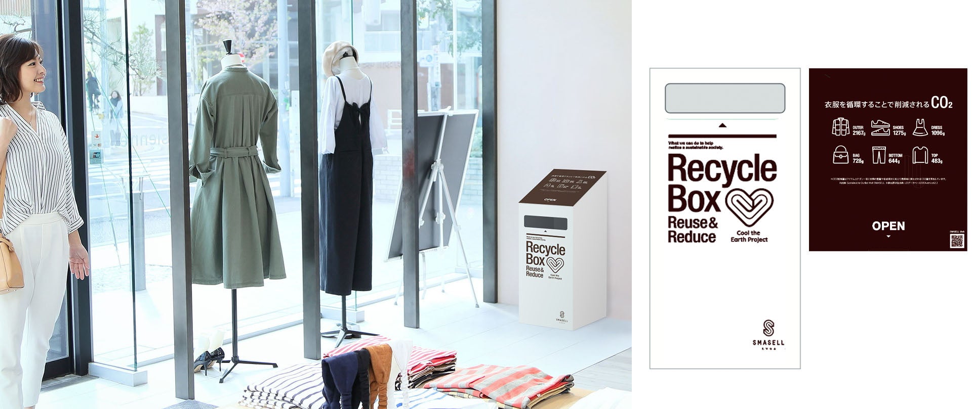 CO2削減量が記されたオリジナル回収ボックスの支給は無償で行い、回収された衣類はSMASELL(スマセル)が買取。それらの衣類の一部を新たなお客様に届けるため再販しています。