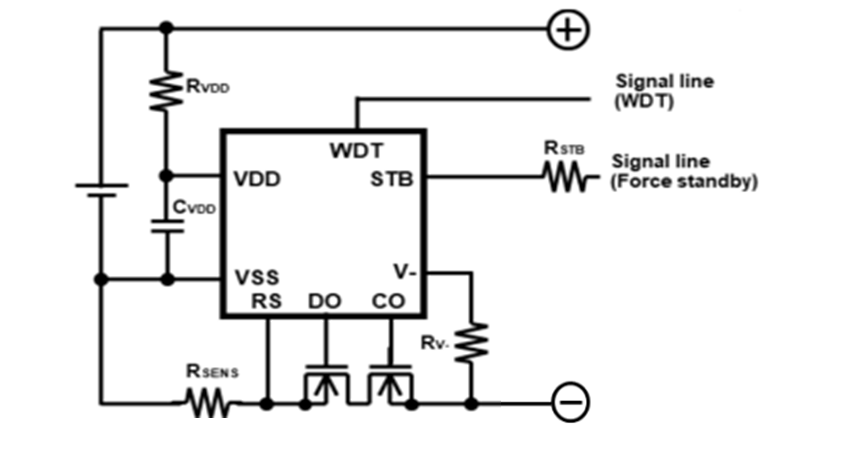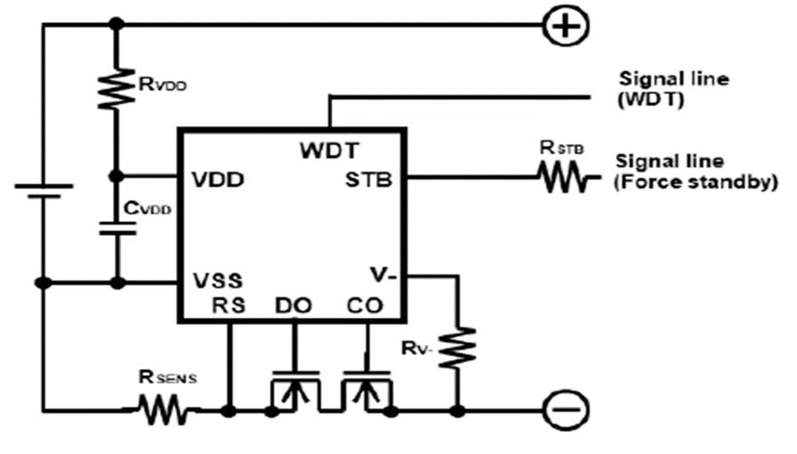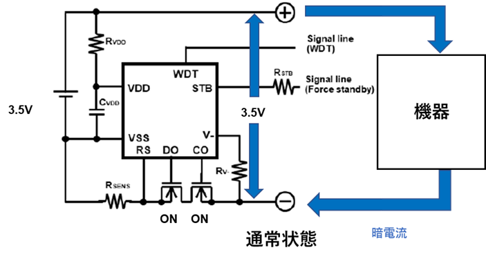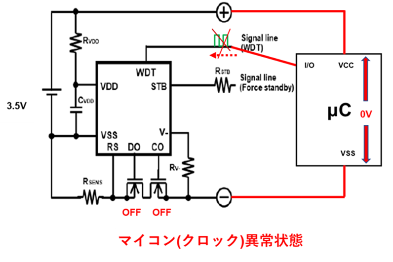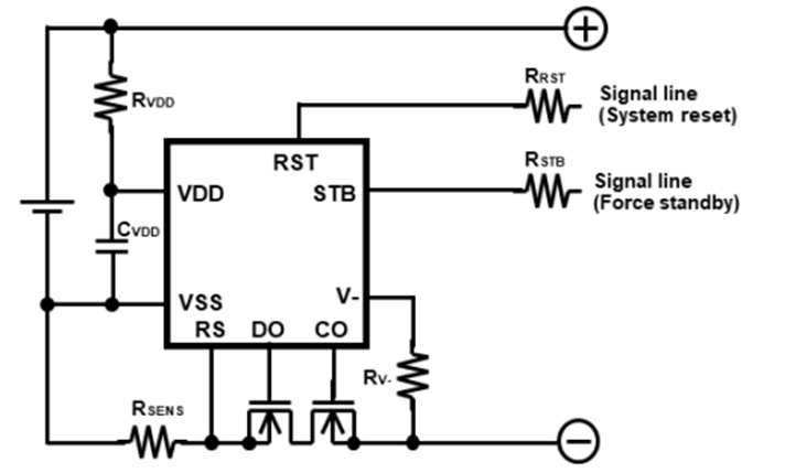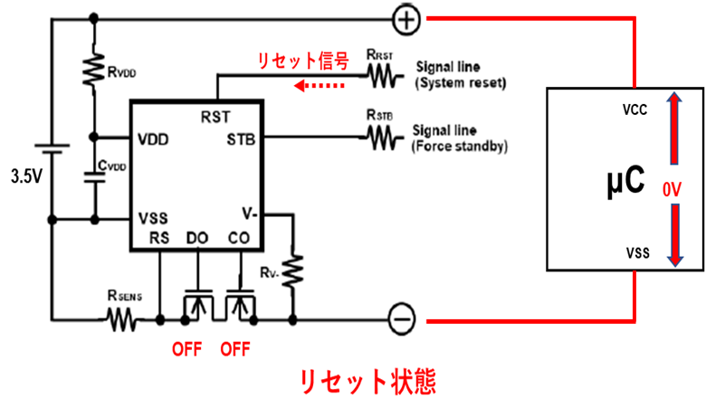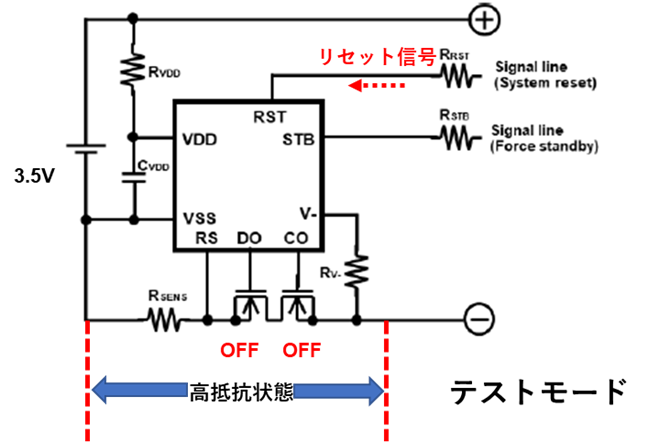 RST(リセット)ピンを使うことで充放電FETをOFFさせて保護回路のリークテストが容易になります。また、RSTピンを設けることでマイコン暴走時にFETをOFFすることでシステムへの電源供給を遮断し、マイコンの電源リセットをかけることでシステムの安定性を向上できます。