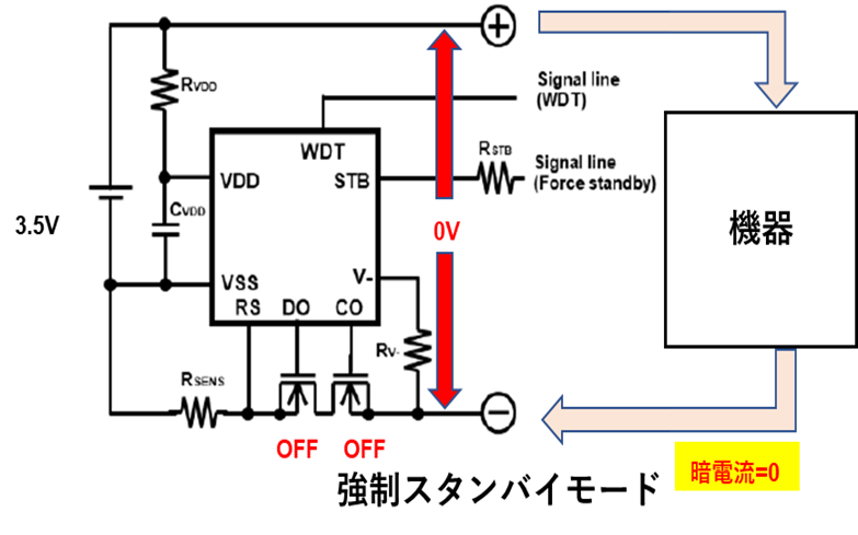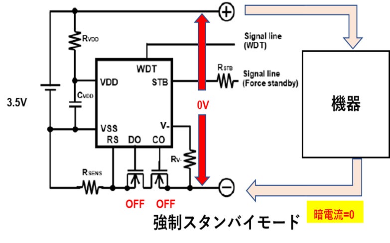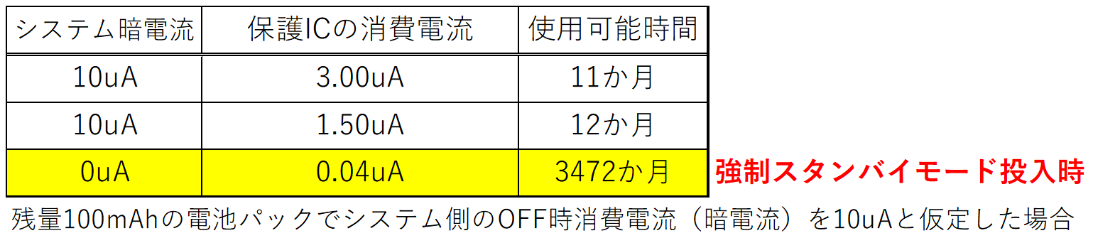 過放電状態にすることなく、STB(スタンバイ)端子を使って強制スタンバイにすることが可能で、充電器を接続するまでは大幅に消費電流を抑えることができます。そのため製品販売前の在庫期間などでの電池の目減りを最小限に抑えることが可能となります。