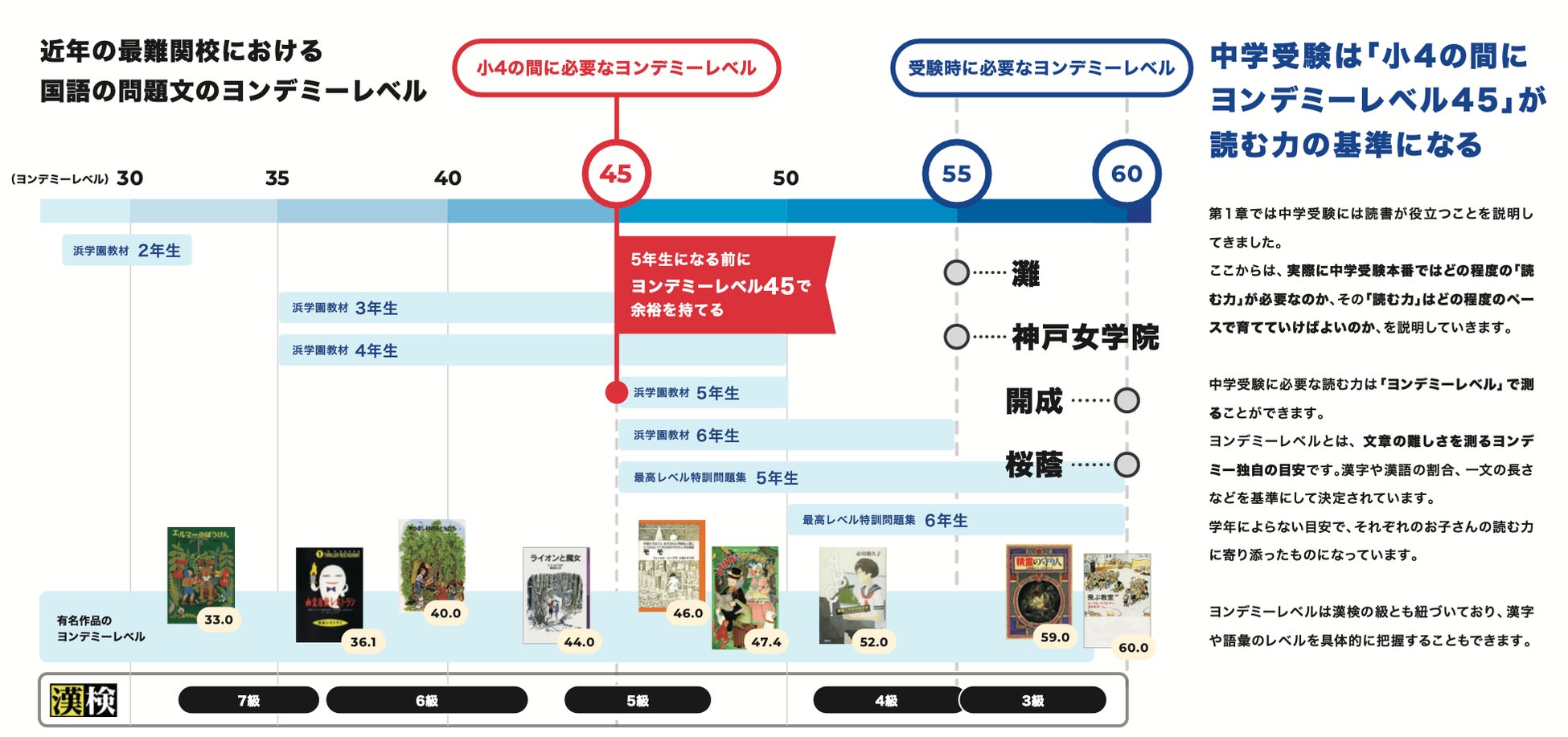 ホワイトペーパーでは、浜学園の国語テキストに含まれる文章題をYondemy独自の指標「ヨンデミーレベル」(※2)で分析。その結果、中学受験に必要な“読む力”の明確な到達基準として「小4の間にヨンデミーレベル45」という新たな指標を導き出しました。