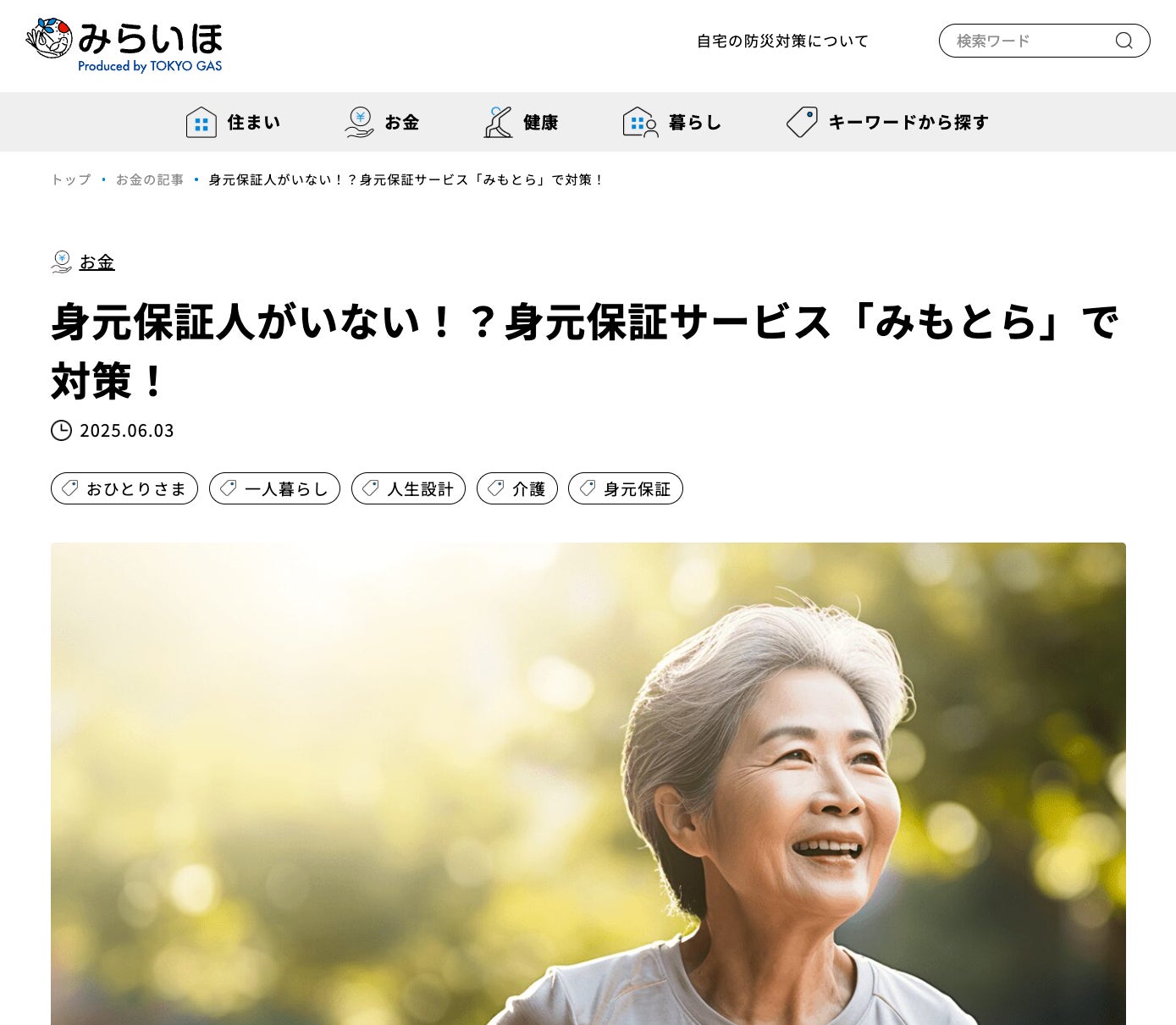 人生100年時代のコンシェルジュとして、シニアの皆様の「いつも」と「もしも」と「さいご」に寄り添う株式会社ファミトラ(所在地:東京都港区、代表取締役CEO:三橋克仁、以下「ファミトラ」)は、2025年4月より提供を開始した身元保証サービス「みもとら」において、東京ガス株式会社(本社:東京都港区、取締役代表執行役社長:笹山晋一、以下「東京ガス」)と提携したことをお知らせします。本提携は、「みもとら」における第1号のアライアンス案件となります。
