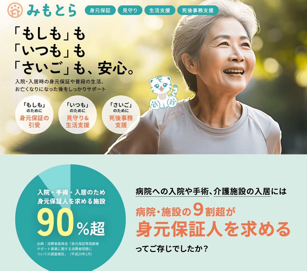 「みもとら」は、おひとり様やご家族に頼れない方々が安心して自分らしい人生を送るための身元保証サービスです。高齢者施設の入居や入院時の身元保証など、さまざまな万が一にワンストップ伴走し、「家族に代わる安心」をお届けします。