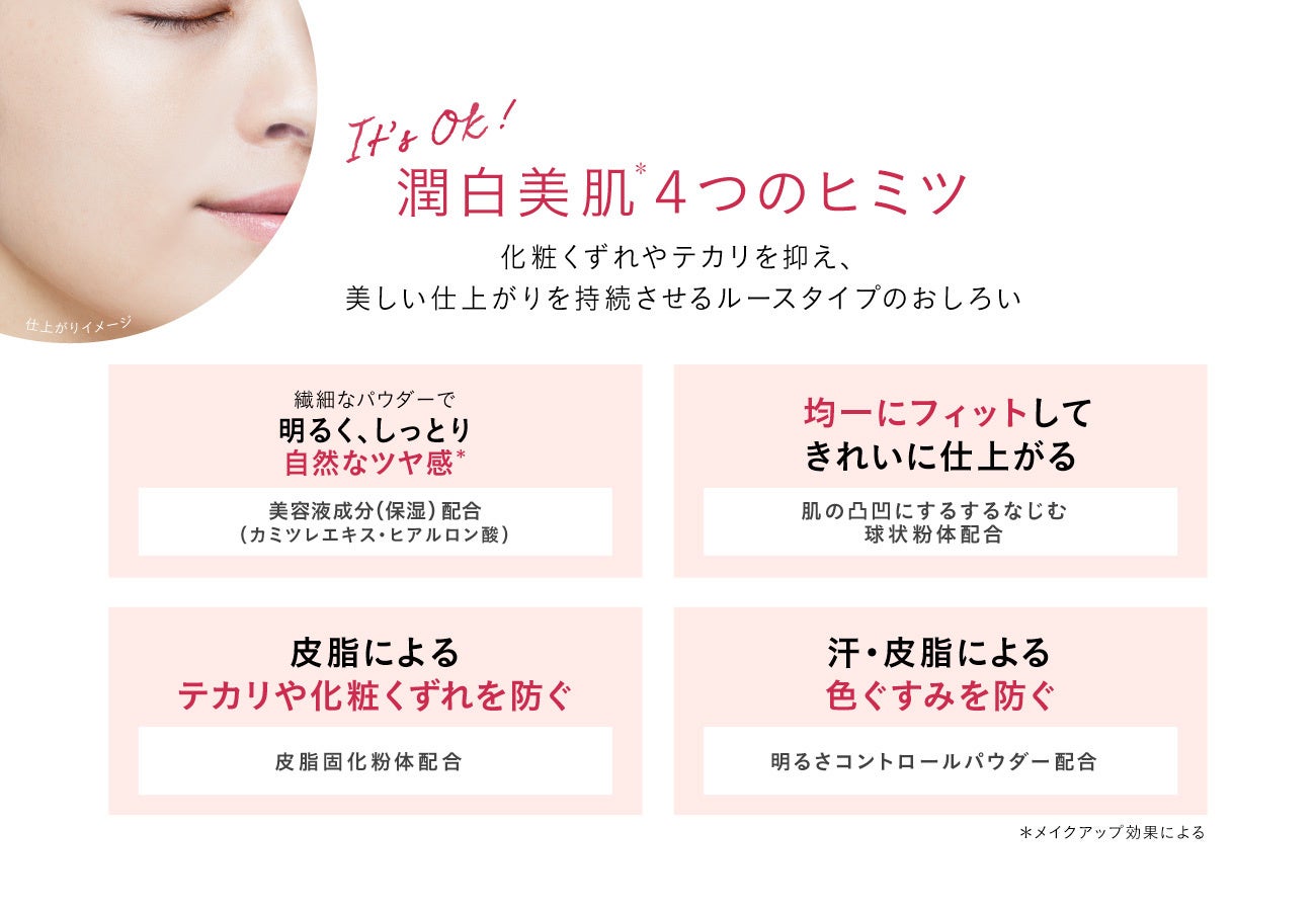 キメ細かなパウダーが、繊細につやめく肌を演出します。さらに化粧くずれやテカリを抑え、透明感のある明るい“潤白美肌”の仕上がりを持続させます。