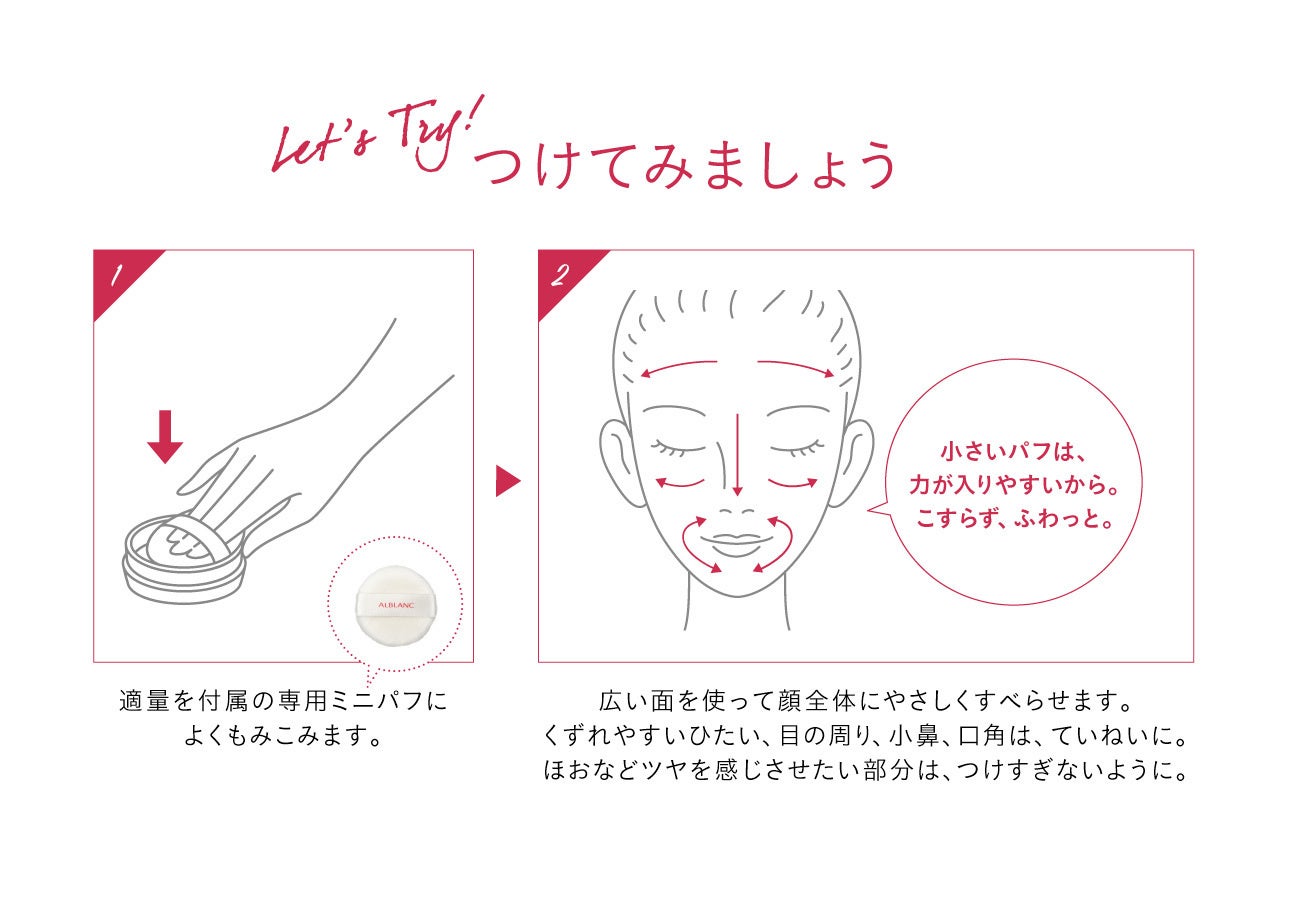 ・パフでネットの上から軽くおさえるように適量を含ませ、顔全体に軽くすべらせるように仕上げます。