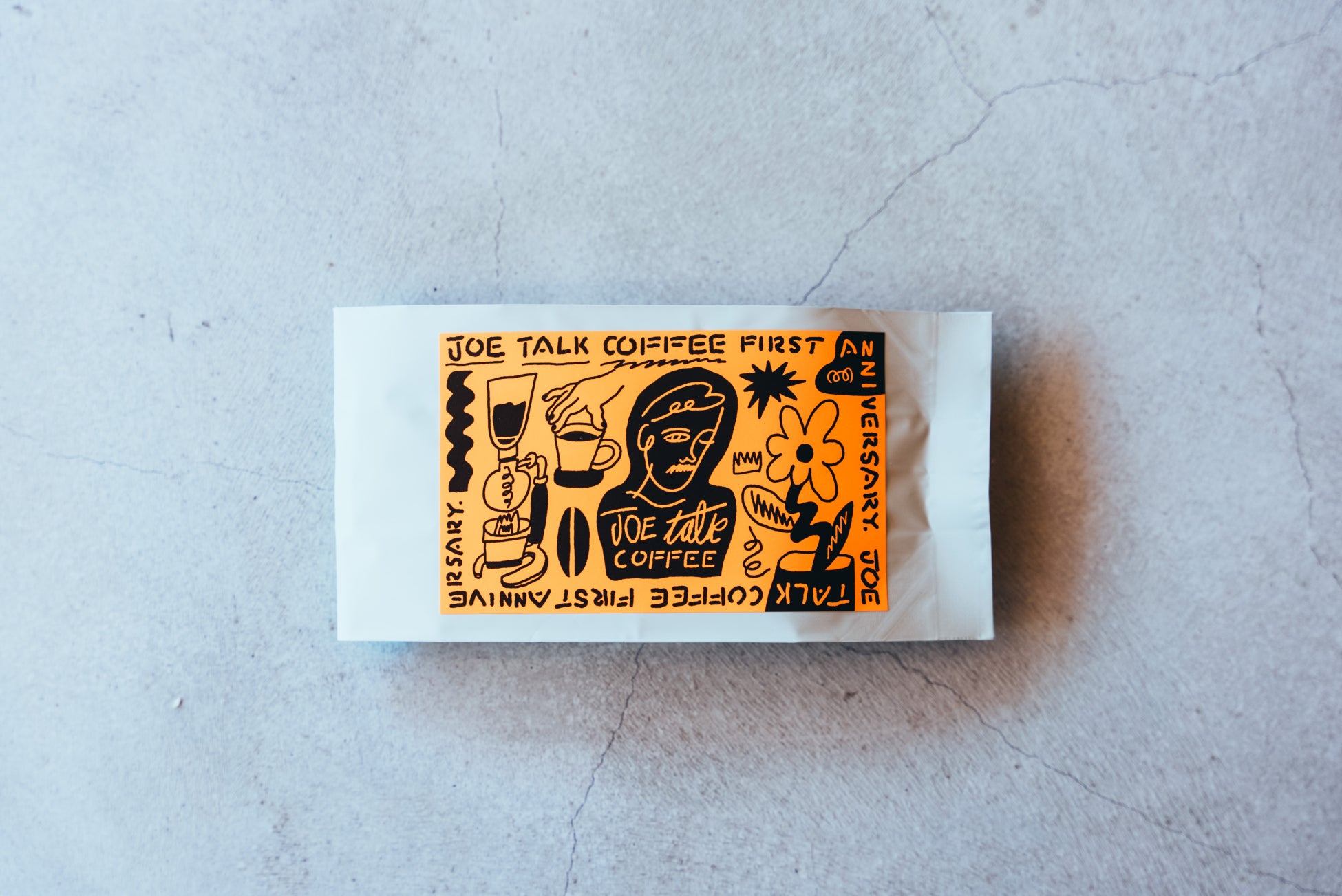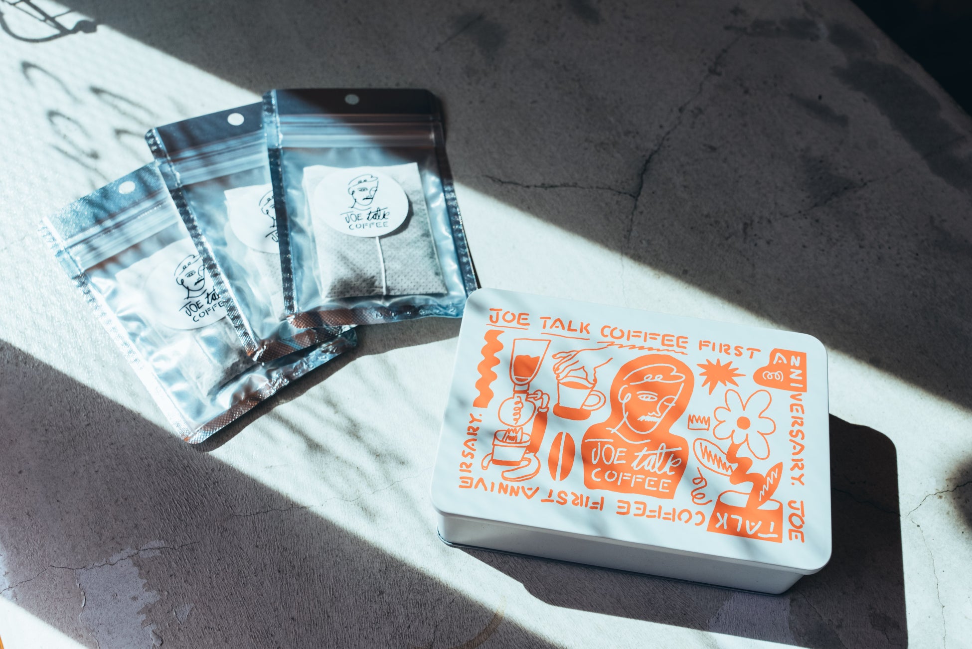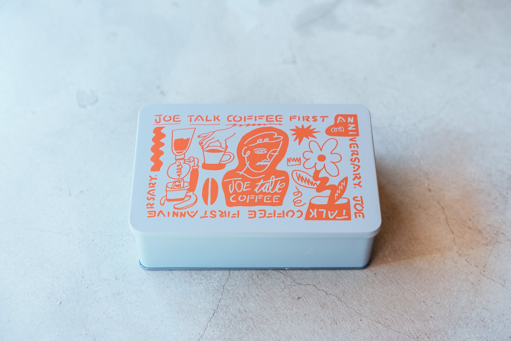 JOE TALK COFFEEのロゴを手掛けたイラストレーター「norahi」氏による、1周年記念デザインパッケージ。クッキー缶のほか、期間限定のコーヒー豆も同時販売いたします。