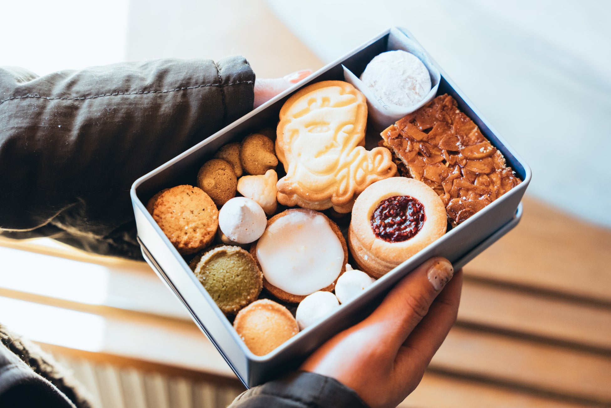 (中央) JOEクッキ、(右から時計回りで) 口溶けメレンゲ3種、フロランタン、ラズベリージャムクッキー、サブレオシトロン、抹茶のディアマン、ディアマン、チーズと黒胡椒のサブレ、コーヒーのブールドネージュ