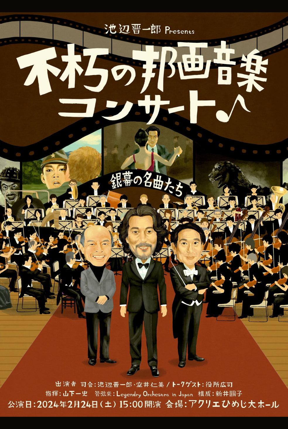 司会は日本を代表する作曲家・池辺晋一郎。そして、世界が称賛する名俳優・役所広司をトークゲストに迎え、豪華にお贈りします。また、演奏中は懐かしのカットをスクリーンに投影しますので、あのシーン、あの場面を思い出しながら、壮大かつ美しいオーケストラのサウンドをお楽しみいだけます。