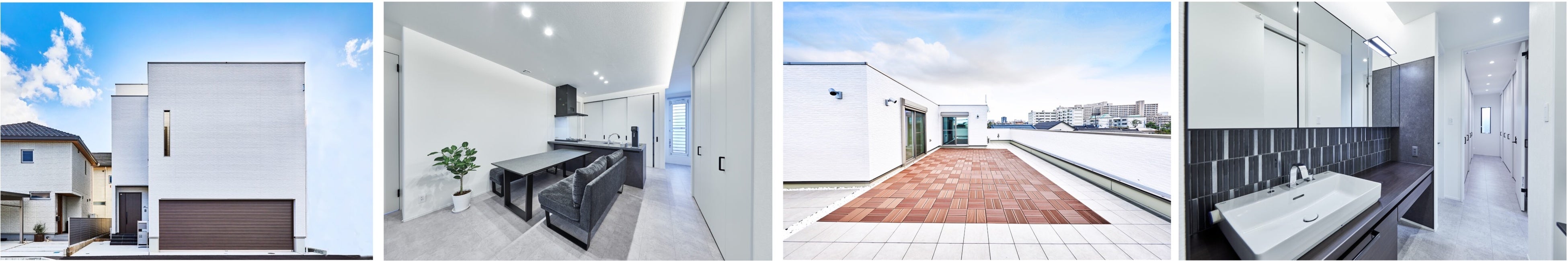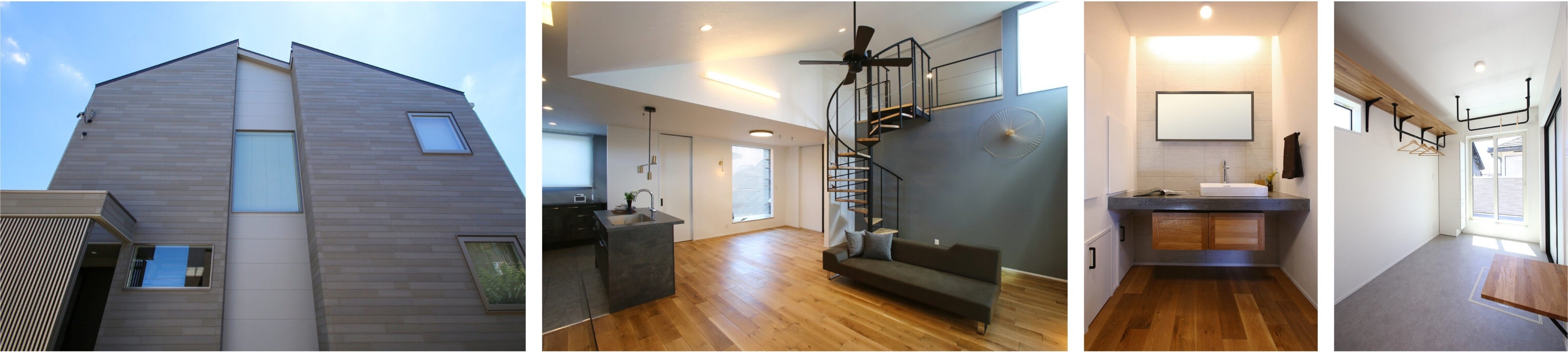 ご夫婦と2人のお子様が暮らす2階建て住宅です。凹凸をつけた個性的な外観で、従来の木造住宅のイメージを払拭したモダンな印象に仕上げました。周囲は住宅街のため、外部からの視線を気にすることなくくつろぐことができる2階リビングを採用しました。LDKは壁面から設備に至るまでグレーを基調とした配色に仕上げ、ロフトに続く螺旋階段が映える落ち着いた空間にしました。窓際にはちょっとした作業用にぴったりのヌックも設けています。2階ホールにはボウルの配置からカウンターの質感までこだわり抜いた造作洗面台を設置し、家族だけではなく、来客時にも使いやすい間取りにしました。バルコニー直結のランドリールームは洗う・干す・畳む作業を一か所で完結でき、日ごろの家事負担を軽減できます。お施主様のこだわりを1つ1つ形にすることで、この家だけの贅沢を味わうことができる唯一無二のラグジュアリー空間ができあがりました。