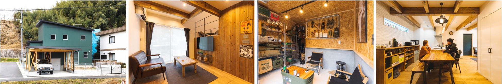 ●プランの特徴床は無垢材を使用し、吹き抜け天井とTVの壁面は板張り、LDKは天井全体が表し梁造りにしました。LDKだけではなく、 2階の各部屋にも表し梁や表し火打ち梁を見せることで、家にいながらも家全体で木のぬくもりを感じつつアウトドアのような雰囲気を楽しめる空間になりました。またスキップフロアの下は、日頃からソロキャンプを楽しむご主人の趣味の空間として、アウトドアガレージを取り入れました。