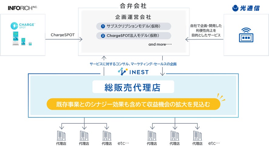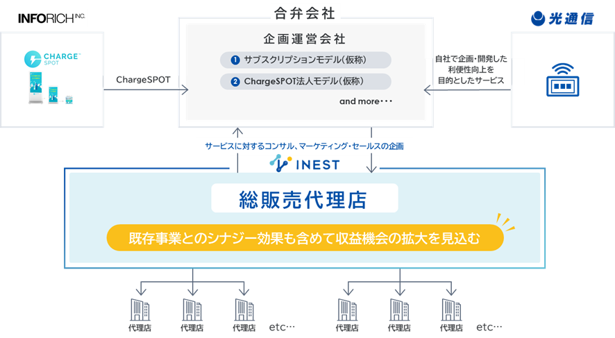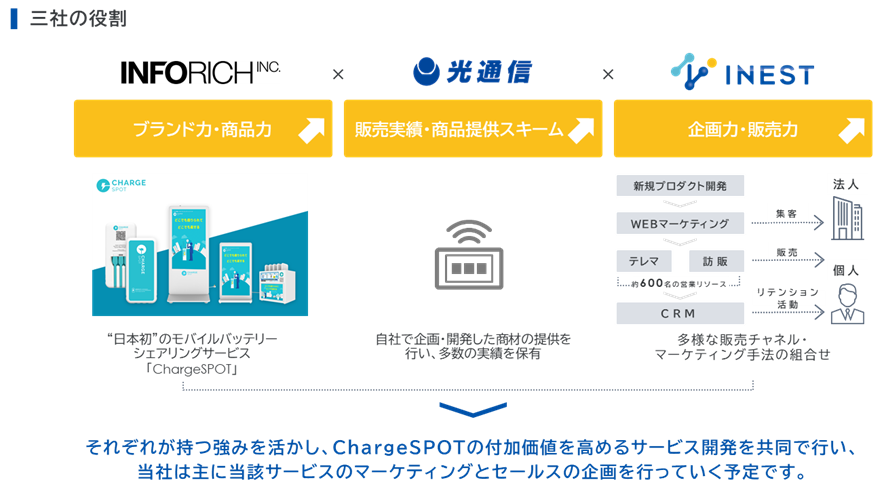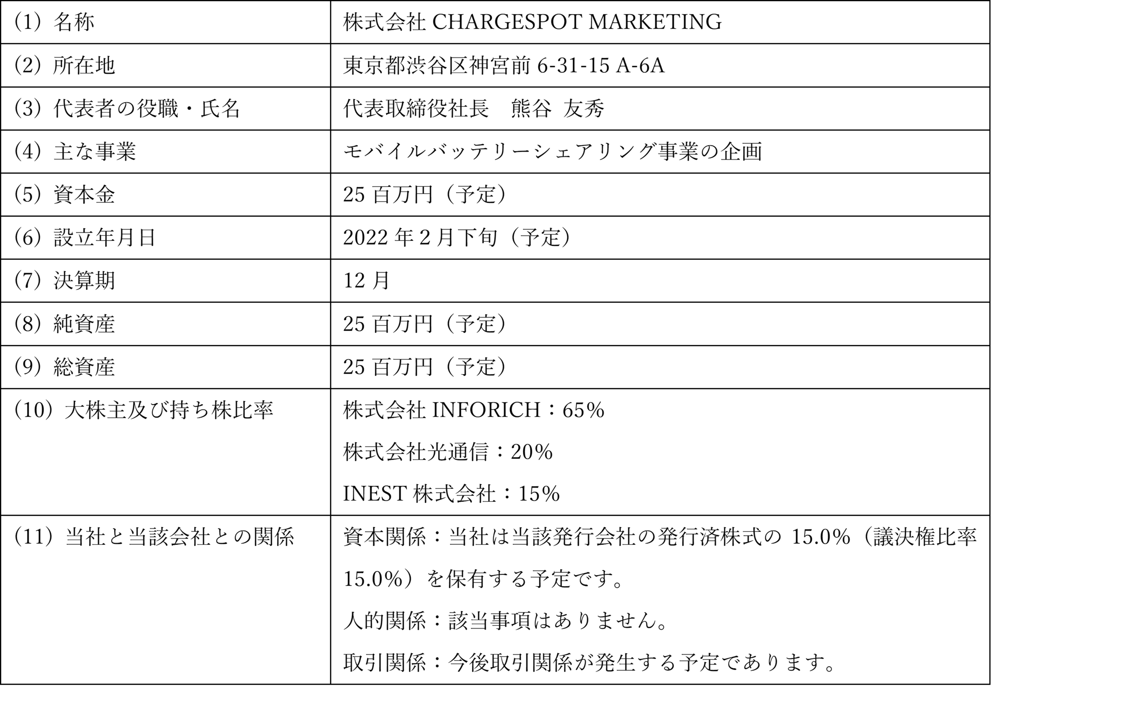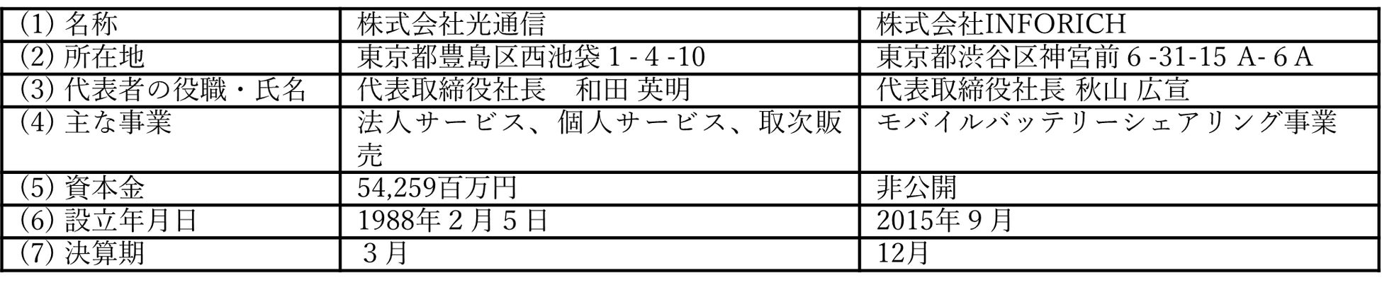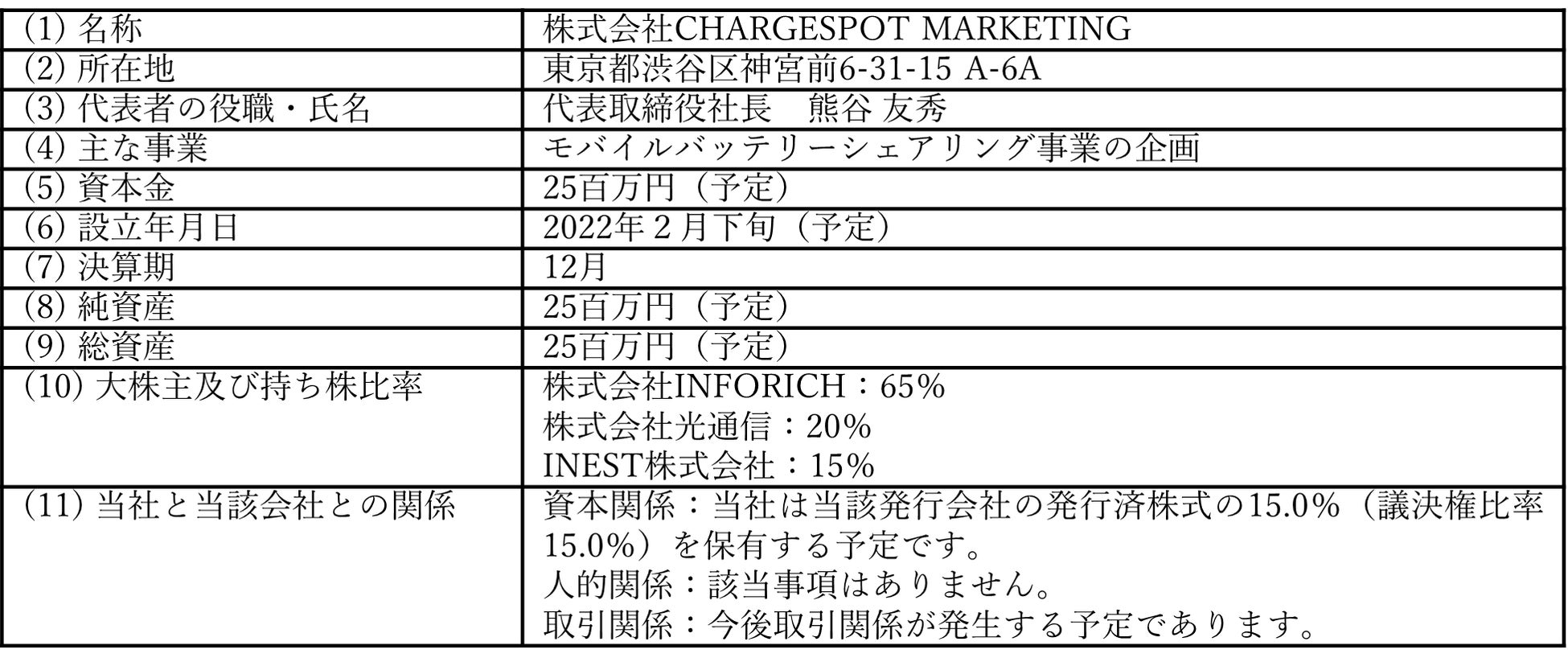 INFORICHは日本におけるモバイルバッテリーシェアリングサービスシェアNo.1(※1)のChargeSPOT(※2)を提供しており、光通信はお客様の利便性向上を目的としたサービスを自社で企画・開発し豊富な販売実績を有していることから、ChargeSPOTの付加価値を高めるサービス(以下「当該サービス」という)の開発を共同で行い、当社グループは当該サービスに対するコンサルティングや、マーケティングとセールスにおける企画を行うことで、それぞれが持つ強みを活かし日本のモバイルバッテリーシェアリングサービスにおいて圧倒的No.1の地位を確立するとともに、顧客の更なる利便性向上を目的とした合弁会社を設立することといたしました。