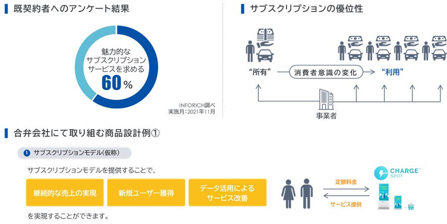 具体的な戦略として、サブスクモデルに関しては、2021年11月にINFORICHがChargeSPOTの利用者に実施したアンケートで、利用者の60%が魅力的なサブスクリプションサービスがあれば切り替えたいという結果が出ており、近年ものを“所有する”のではなく“利用する”という消費者意識の変化のもと、サブスクリプション型のサービスを企画・販売することでChargeSPOTの利用シーンや新規利用者の取り込みが見込めるものと思料しております。