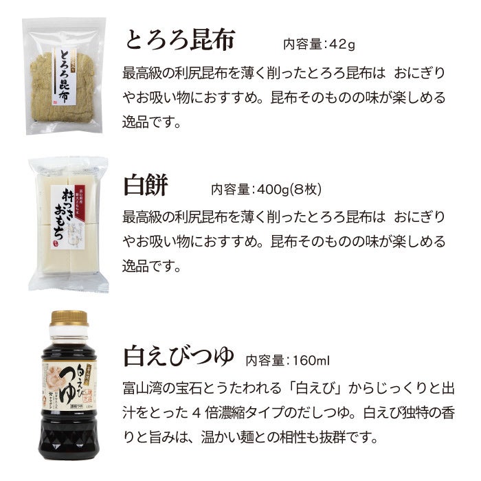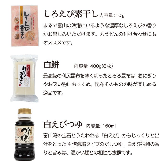 富山の力うどんAセットは、”つるっとした喉越しがクセになる”小さなお子さまやご年配の方にも食べやすい「手延べ極細清流うどん」と、しろえびせんべいプレミアムの「しろえび撰」や「しろえび素干し」が付いた濃厚なしろえびの風味が楽しめるセットです。
