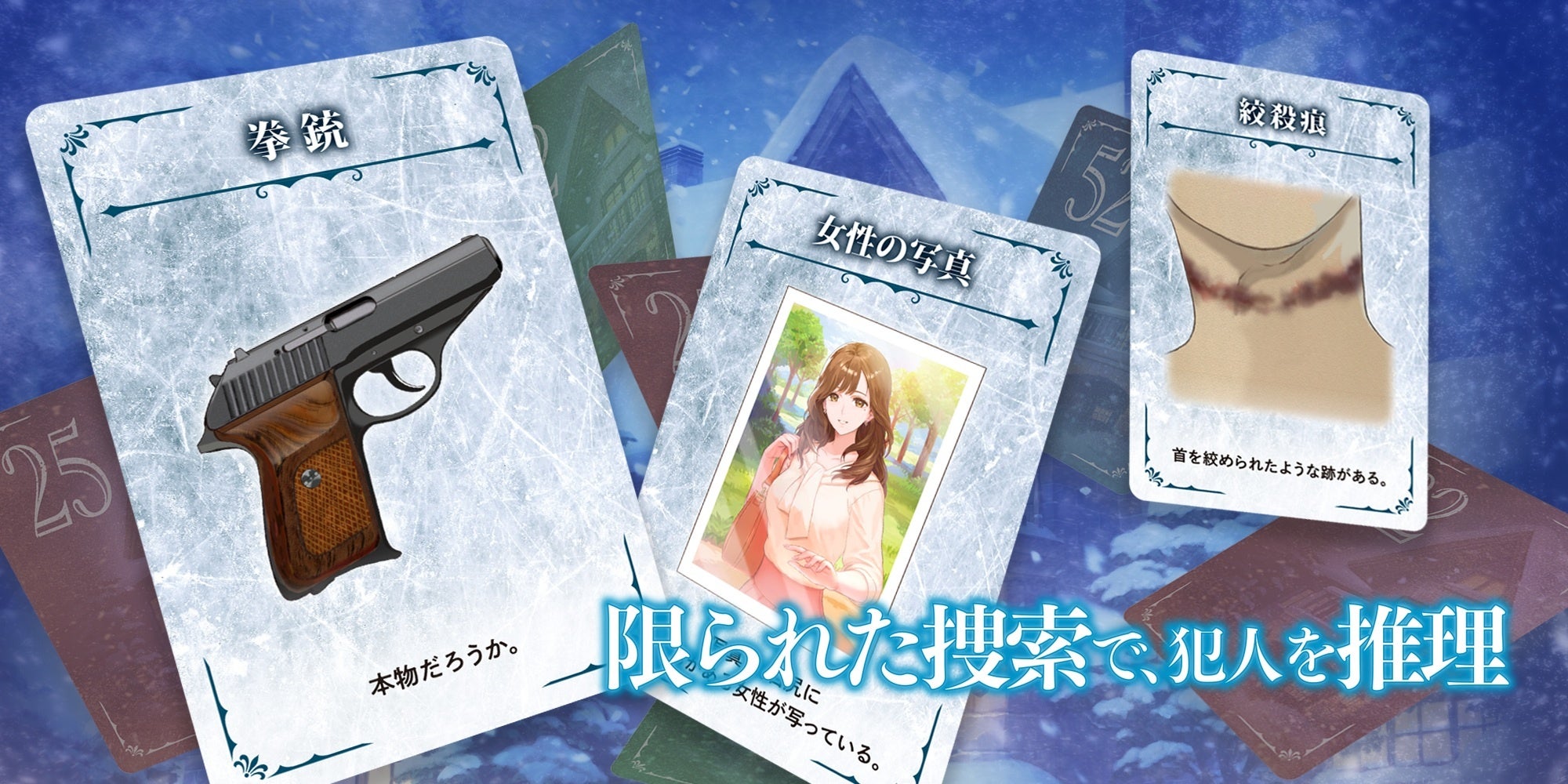 「迷宮推理 連譚(オムニバス)」は非対称協力型の推理カードゲームです。殺人が起こった雪に閉ざされた館を舞台に、多彩な状況の小篇(シナリオ)が用意されています。小篇ごとに背景や配役が変わり、プレイヤーたちは登場人物となって各々に与えられた情報をもとに自分たちの中に潜む殺人犯を探っていきます。