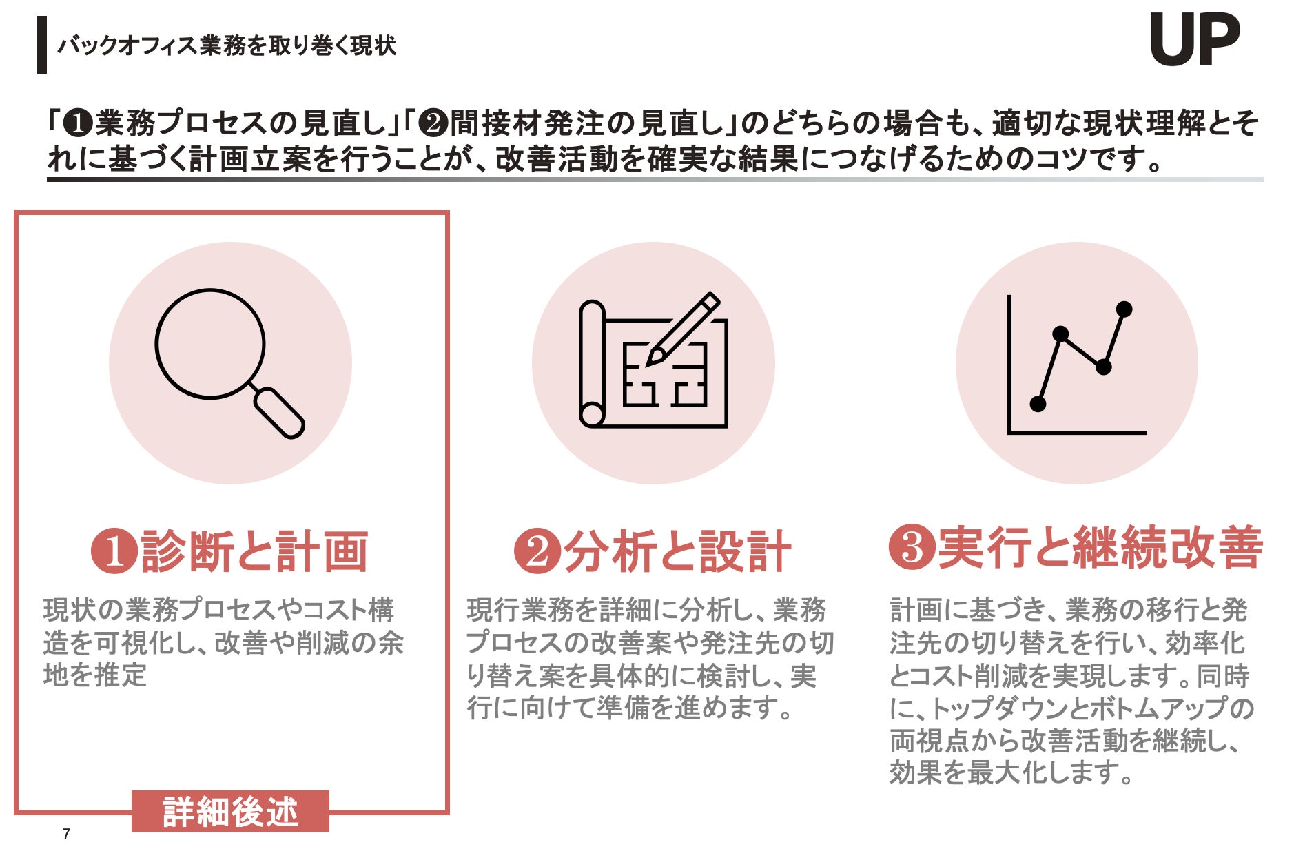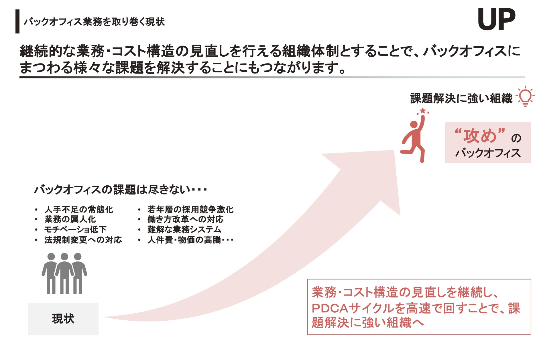 そういったバックオフィス業務の業務・コスト構造の見直しを実行し、「課題解決に強い攻めのバックオフィス」を実現するのが本サービスです。