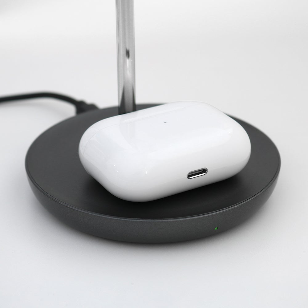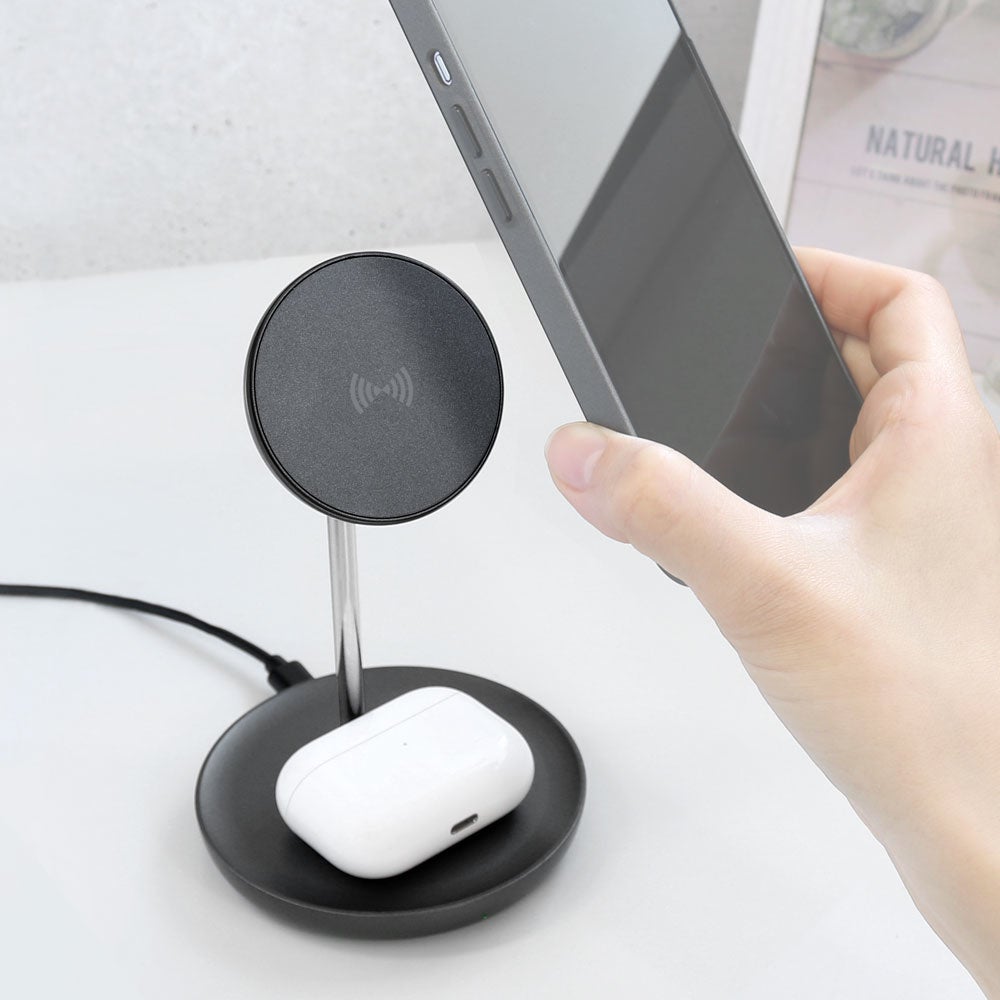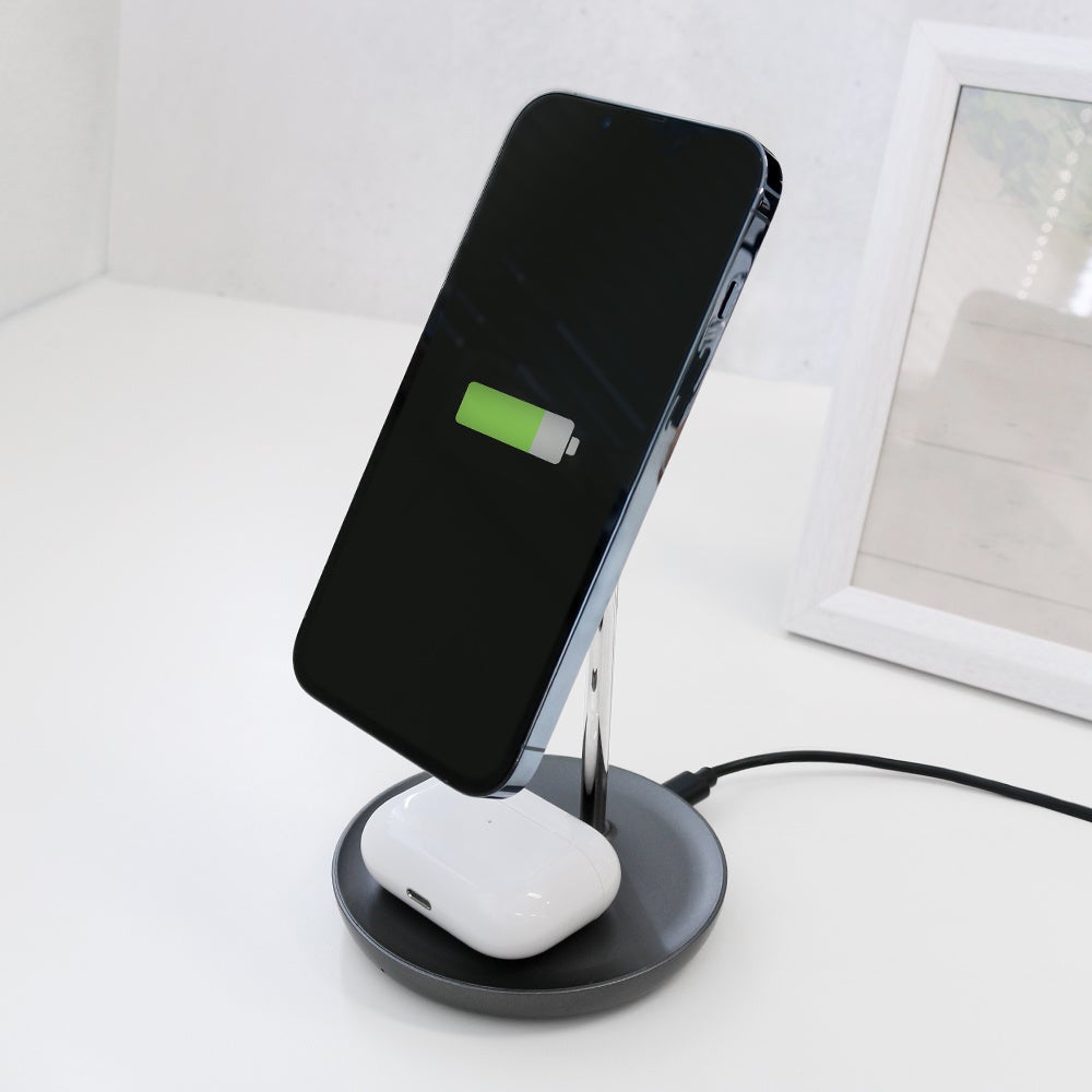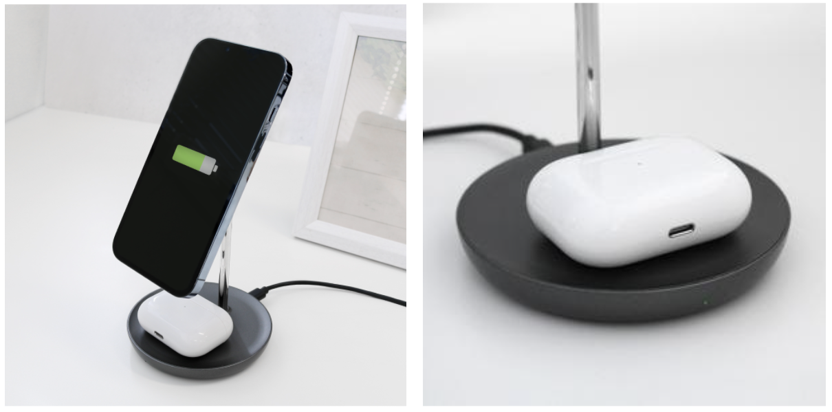 MagSafeに対応したiPhoneとAirPods with Wireless Charging CaseやAirPods Proを同時に充電できる2in1ワイヤレス充電器です。iPhone用ワイヤレス充電器とAirPods用ワイヤレス充電器をスタイリッシュに一体化しました。