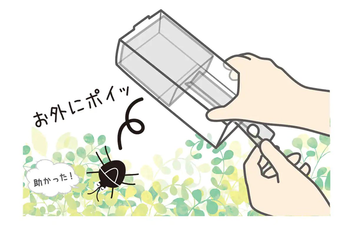 蜘蛛やゴキブリやカメムシなど触りたくないけど家に居られると困る虫を、触らずにキャッチして処理できるグッズ。殺虫剤を使わないから小さなお子様や環境にも優しく、安心してご使用できます。