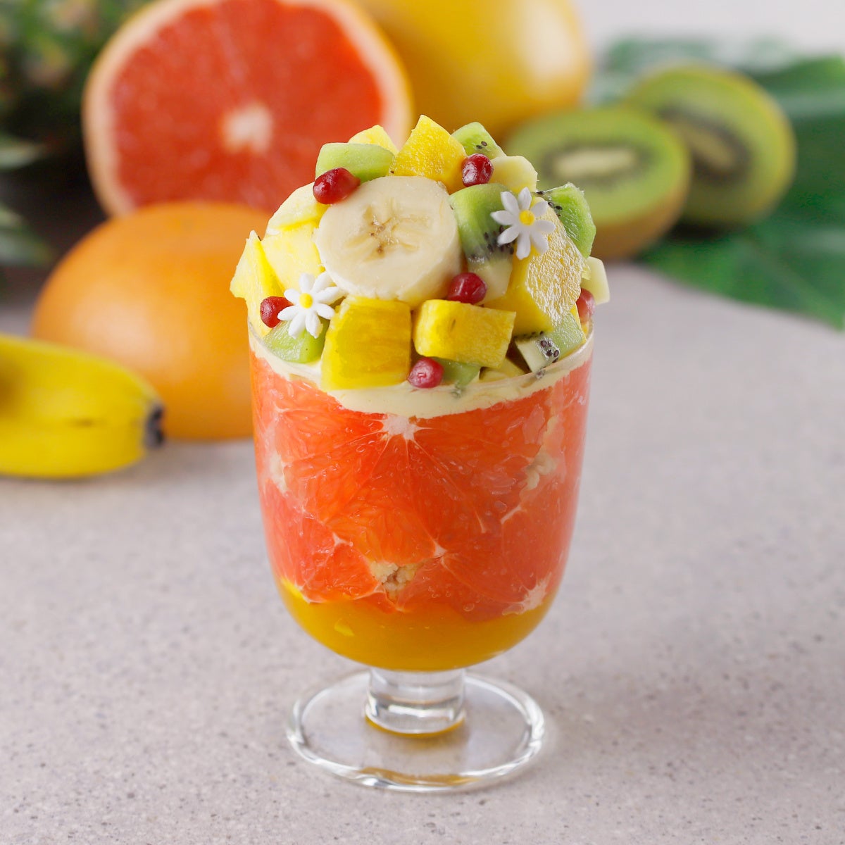 ■パスティヤージュ(花) ■ザクロ ■パイナップル・キウイ・バナナ ■自家製パッション・マンゴーソルベ ■ココナッツのメレンゲ ■マンゴーのエスプーマ ■ホワイトチョコクリスピー ■自家製ヨーグルトソルベ ■ふわふわジェノワーズ ■自家製カスタード ■ピンクグレープフルーツ ■パッションフルーツのジュレ