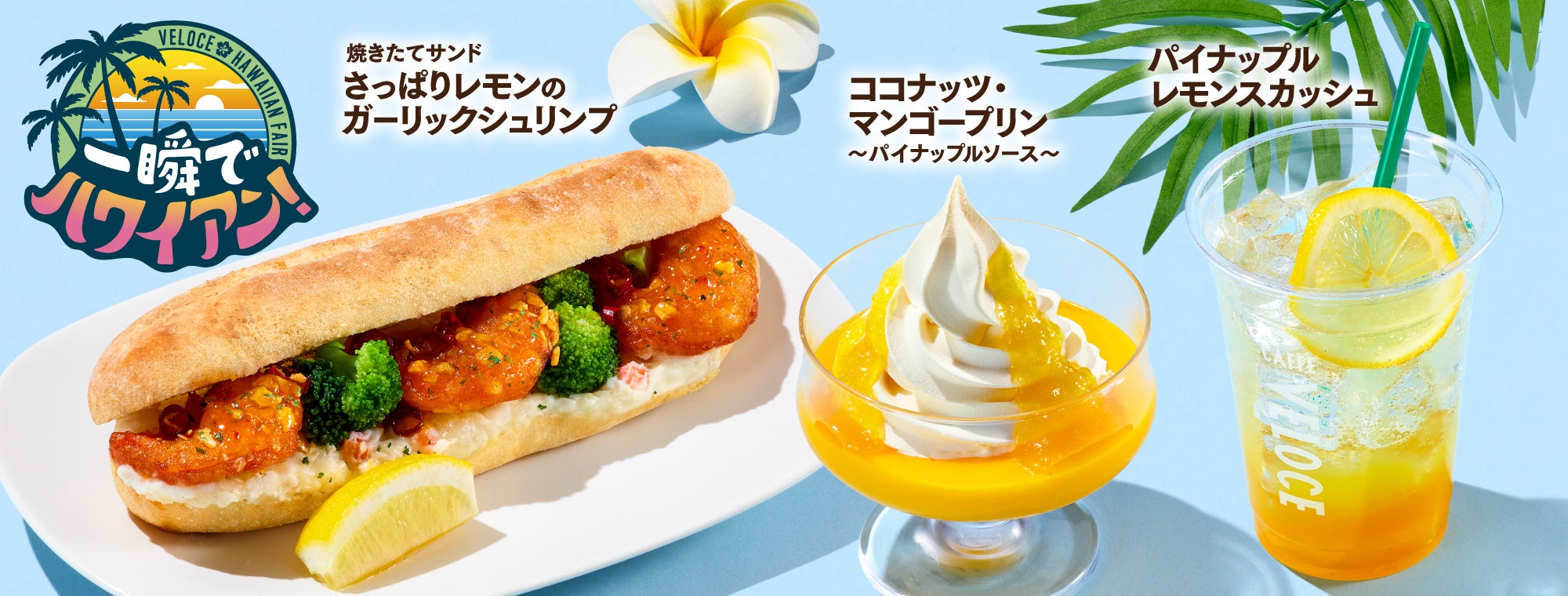 海外の旅行先として絶大な人気を誇る、南国のリゾート“ハワイ”。この夏、『カフェ・ベローチェ』では、お店にいながら一瞬でハワイ気分を味わっていただけるよう、ハワイの定番グルメ「ガーリックシュリンプ」が入った焼きたてサンドや、とろっとトロピカルなマンゴーのプリン、シュワっと弾けるパイナップルのレモンスカッシュの、3つのハワイアングルメを新発売いたします。