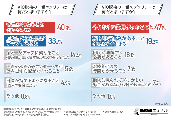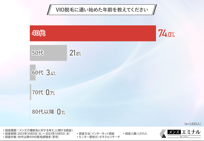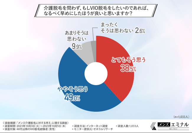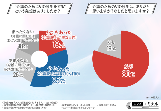 そこで今回、メンズ専用脱毛クリニック・メンズエミナル(https://mens-eminal.jp/lp/?refmedia=31073)は、40代以降のVIO脱毛経験者(男性)を対象に、「メンズ介護脱毛に対する考え」に関する調査を実施しました。