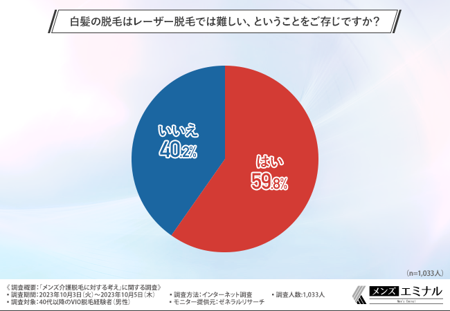 「白髪の脱毛はレーザー脱毛では難しい、ということをご存じですか?」と質問したところ、約6割の方が『はい(59.8%)』と回答しました。