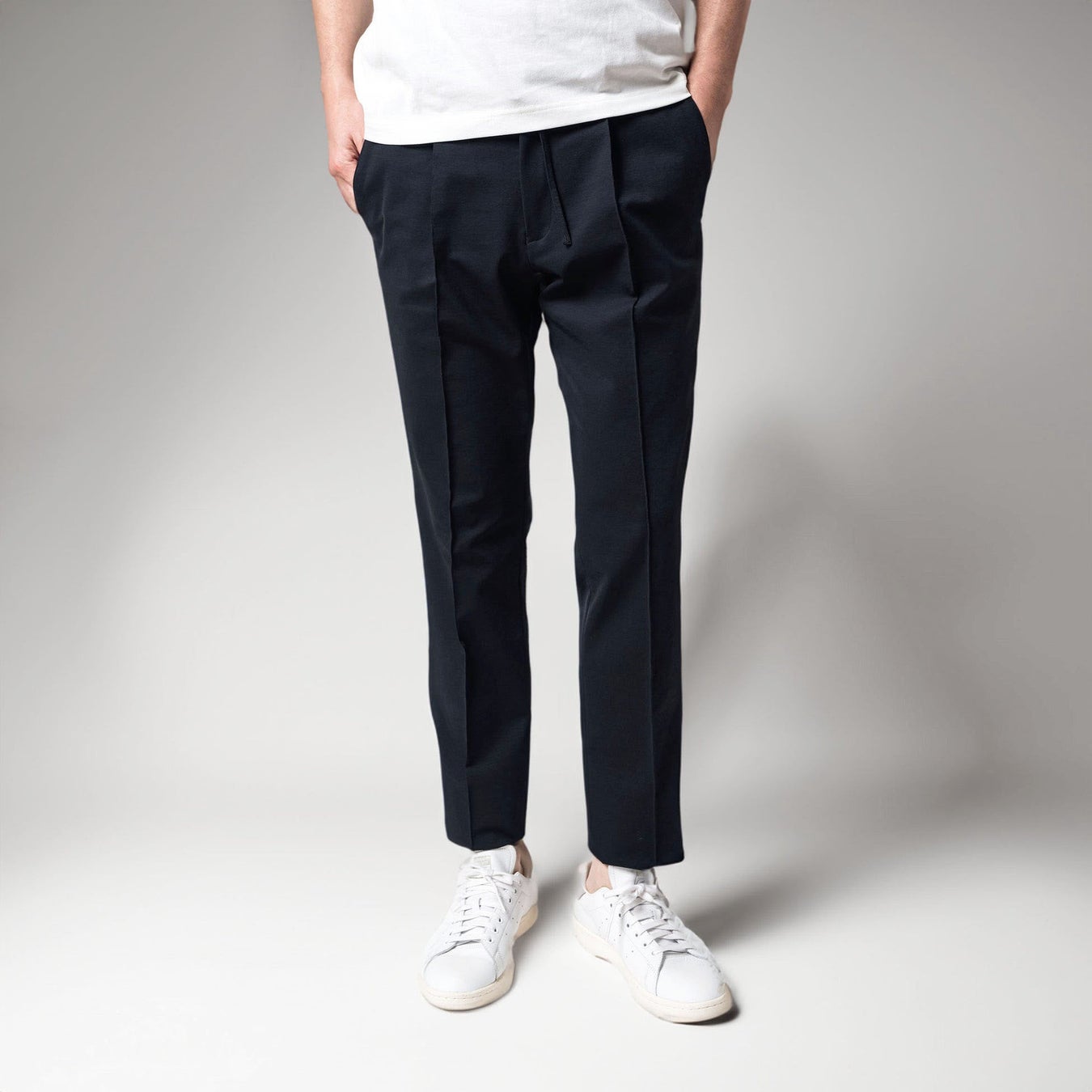 裾にかけて絞りをかけたテーパードシルエットで、ジャケットを合わせたフォーマルなシーンから、休日のきれいめコーディネートにまで幅広く対応。
