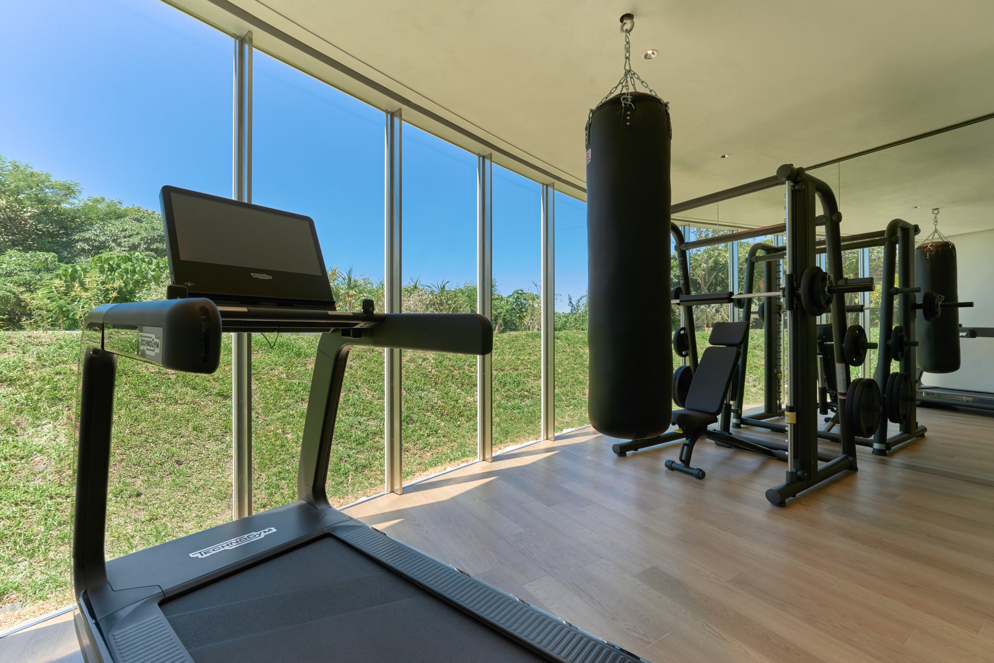 1Fに位置するサウナスペース。2Fのプール傍にある水盤に差し込んだ光がサウナ室の天窓から降り注ぎ、まるで海底にいるような特徴的な空間を作り出す。サウナ室の前にはシャワー2台と水風呂を配備。木の扉を開けば、開放的な外気浴スペースへと通じ心身をリセット。ジムはランニングマシンやサンドバッグ、スミスマシン、ダンベルなどが揃っている。