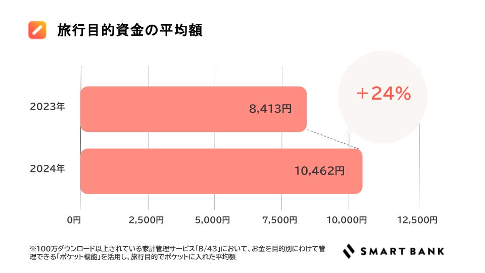 B/43には、お金を目的別にわけて管理できる「ポケット」機能*があります。2024年に旅行目的で作成されたポケットの数は前年比1.7倍に増えました。また、旅行目的のポケットに入れている平均額は2023年が8,413円だったのに対し、2024年には10,462円となり前年比24%の増加となりました。