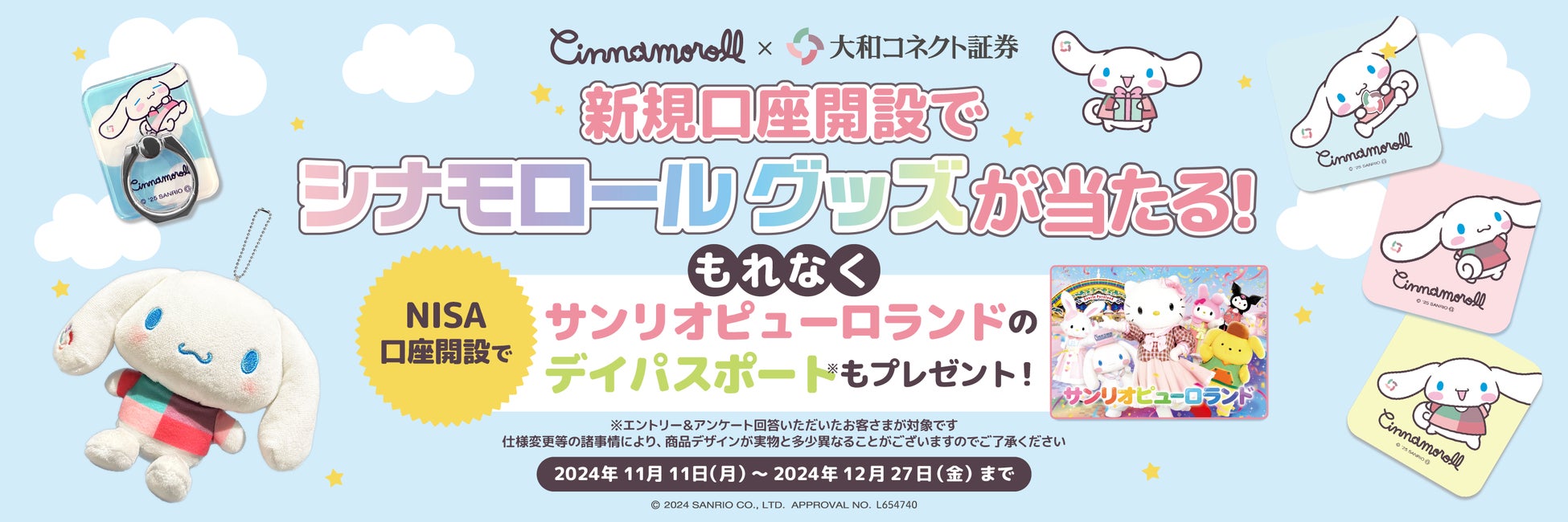 大和コネクト証券は、「シナモロール」を新イメージキャラクターとして採用したことを記念して、2024年11月11日(月)より、「シナモロール グッズが当たる!新規口座開設キャンペーン」を実施いたします‼