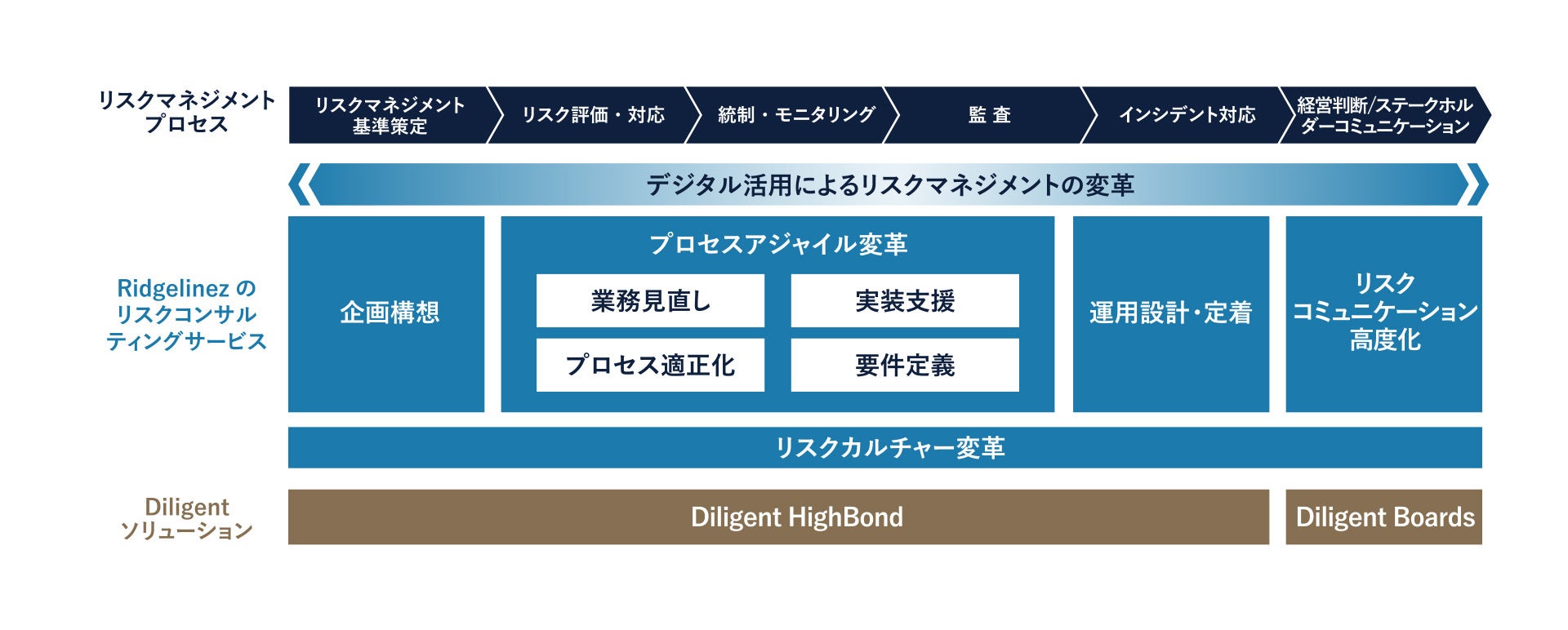 Diligentが提供する「Diligent HighBond」 は、リスクマネジメントの業務領域を幅広くカバーするGRC SaaSプラットフォームです。サイロ化したデータを一元管理するとともに、各リスクマネジメント業務におけるプロセスの簡素化・自動化・統合によりリスク管理の効率化を支援してきました。また、Ridgelinezは、リスクマネジメント全体の企画構想から、業務の見直し・プロセスの適正化、GRCソリューションにおける要件定義・実装支援、そして運用設計・社内展開までをEnd to Endで支援しています。