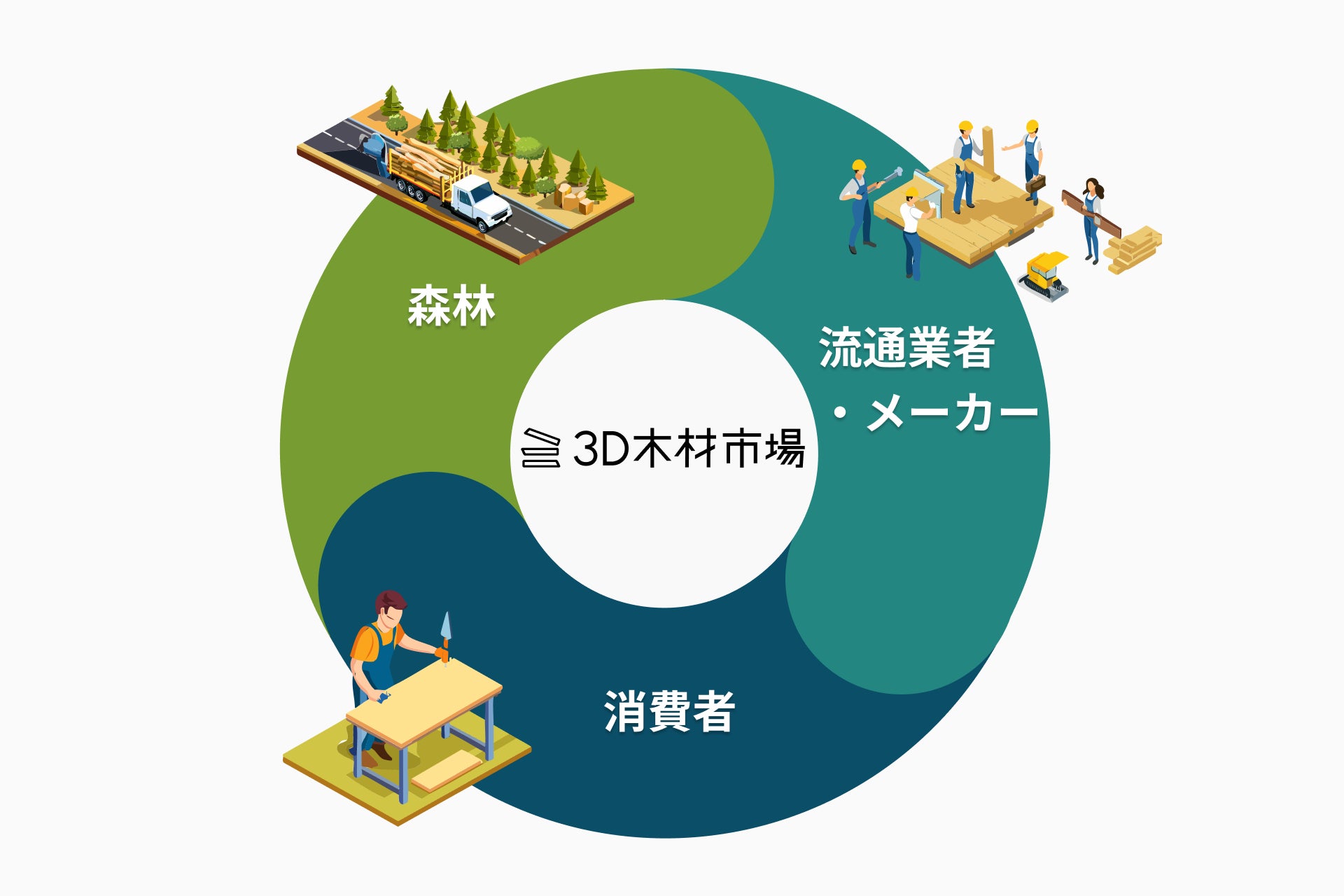 3D木材市場はオンライン上で木材をやりとりできる場として、規格外の木材の利用を促進します。また林業事業体や個人の山林保有者が直接出品でき、個人で購入できることから「消費者」と「森林」をつなげる役割を果たします。