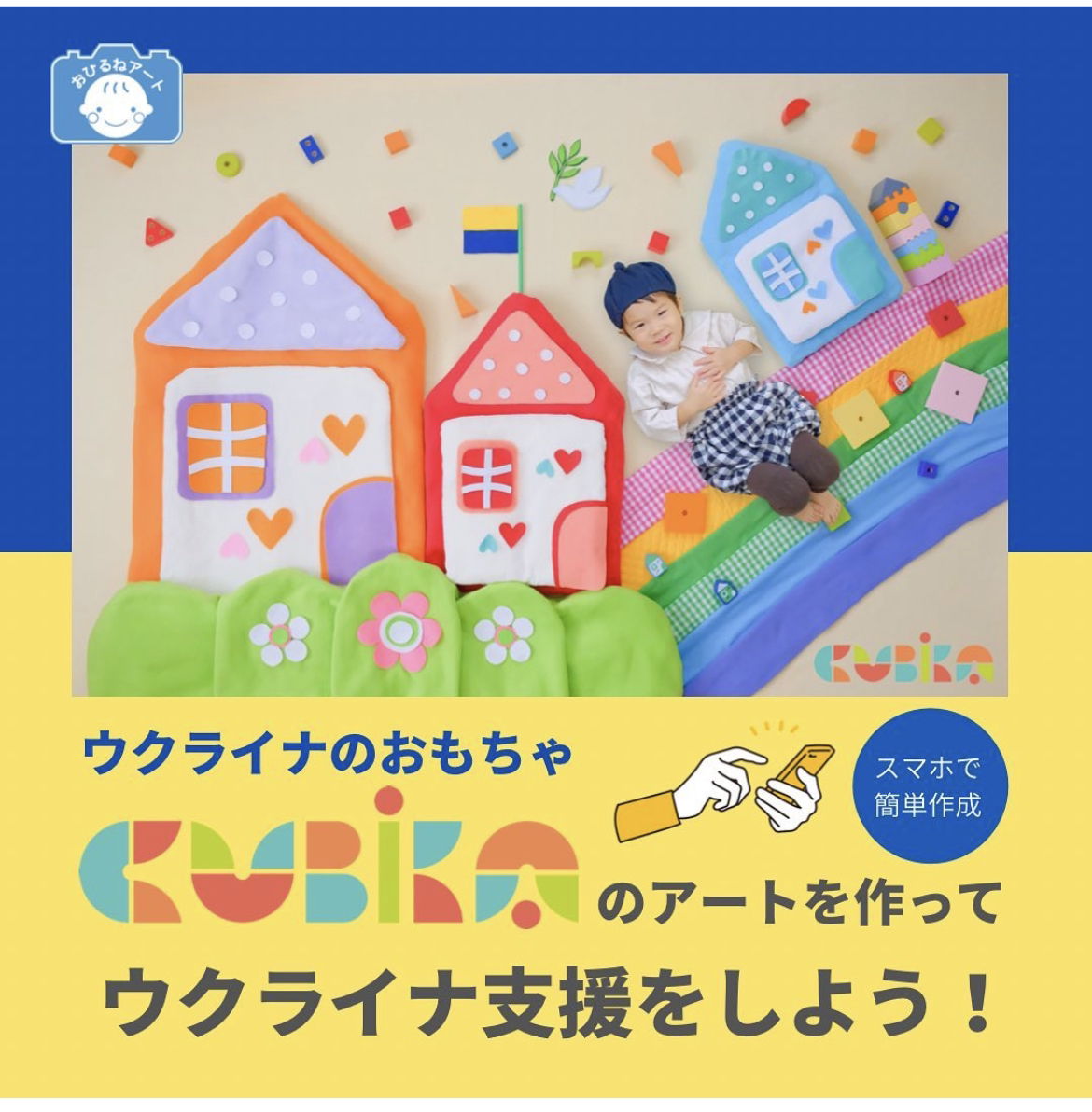 「CUBIKA(キュビカ)」の木製玩具をモチーフとし、平和の象徴でもある鳩とオリーブを入れることでウクライナに平和が訪れるよう願いを込め、お子様の可愛い写真が撮れる「ウクライナ支援おひるねアート」を作成しました。