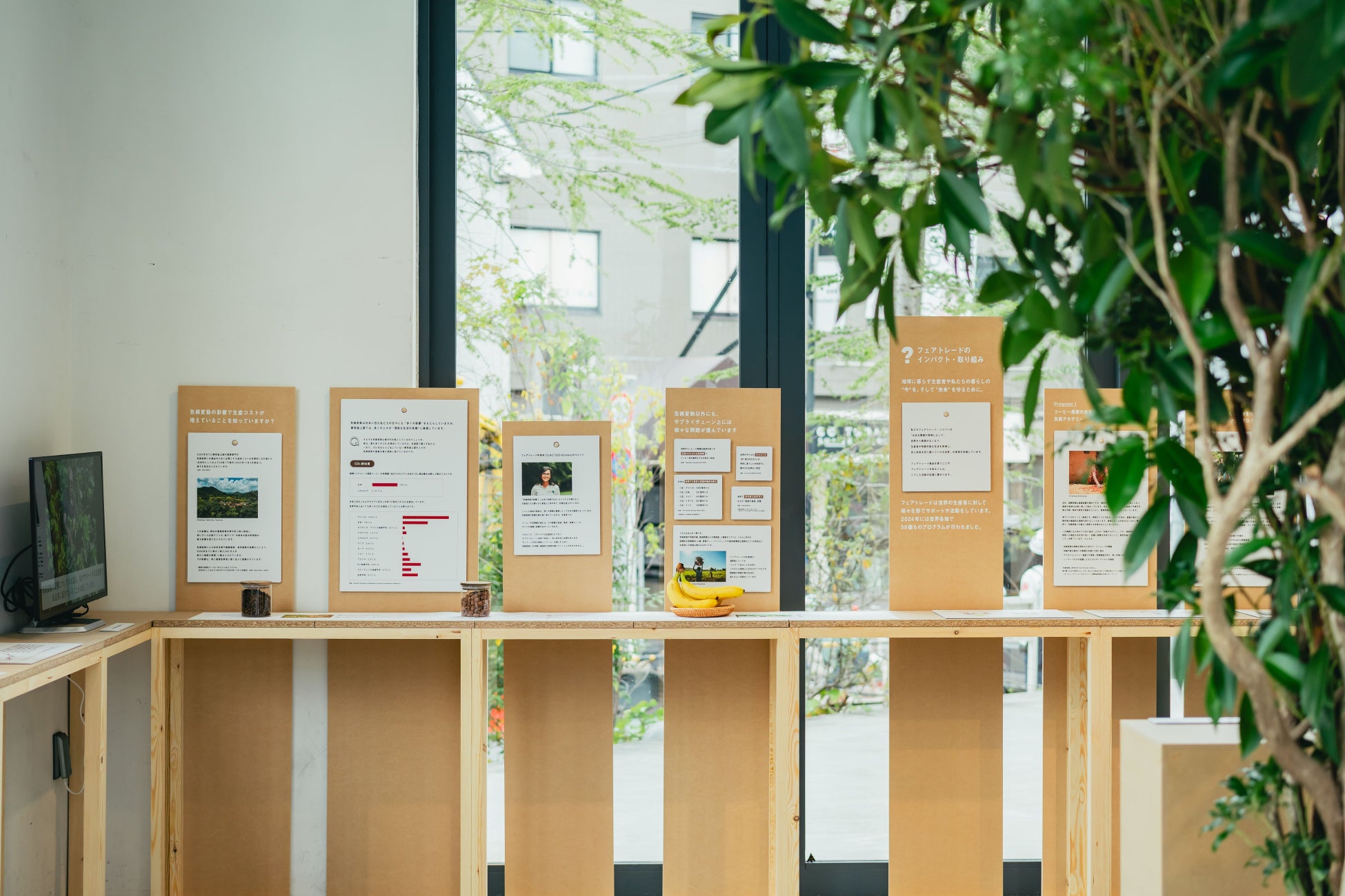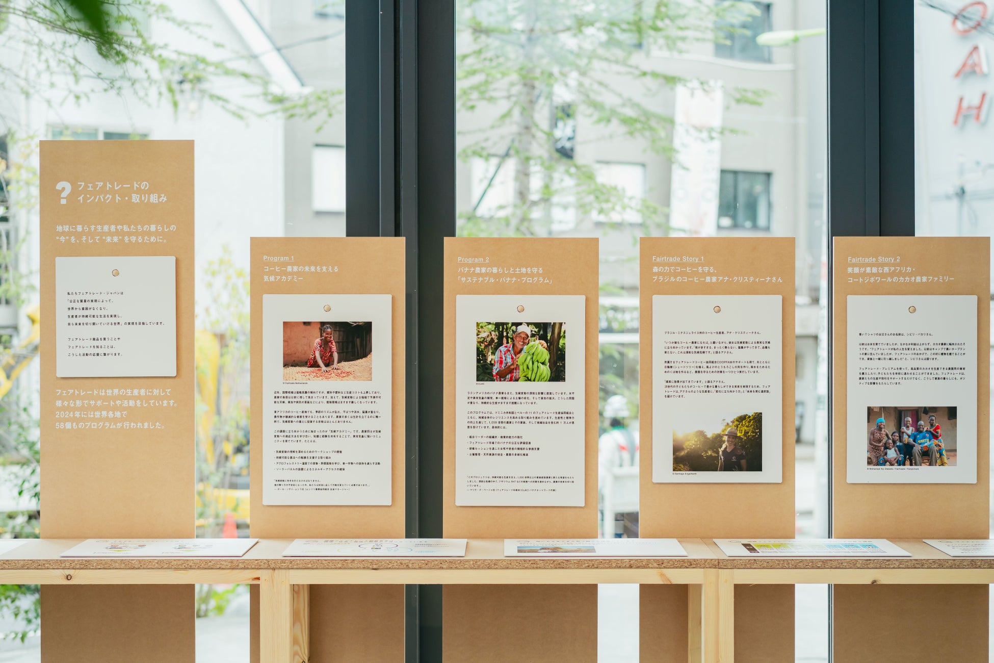 こうした“しわ寄せ”に対して、フェアトレードがどう現場を支えているのかを紹介します。経済・社会・環境といった各側面や、取引時に上乗せして支払われ地域の貧困削減や生産の向上に繋がるプレミアムの説明、気候アカデミーやサステナブル・プログラムなど、各地で実施された具体的なプログラムを実例として展示。また、フェアな調達や啓発活動など企業も解決の担い手であることを伝えます。