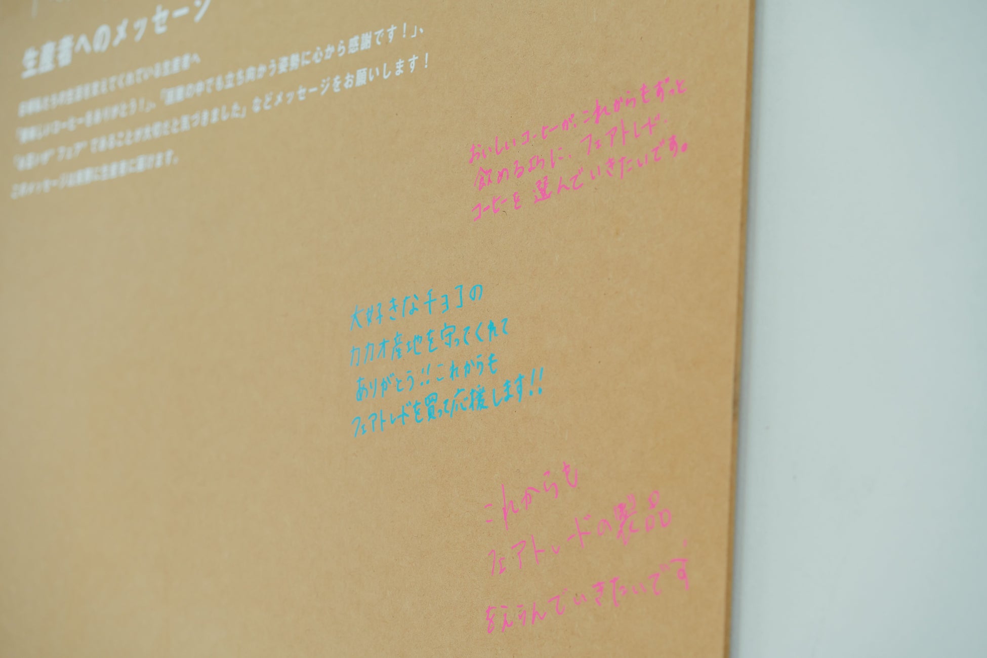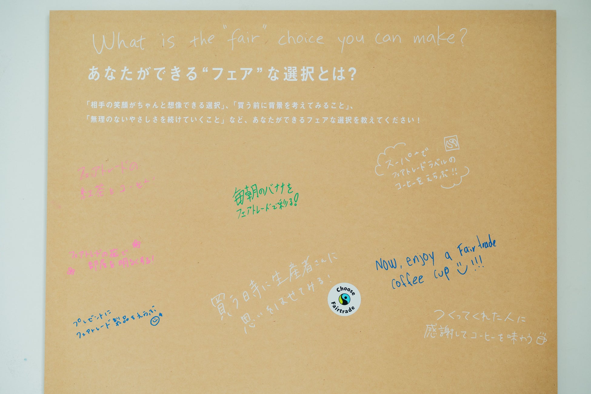 展示内容を観覧後、参加者に「あなたができるフェアな選択とは?」や「生産者へのメッセージ」を書いてもらうボードを設置。集まった声は実際に生産地へ届けられます。