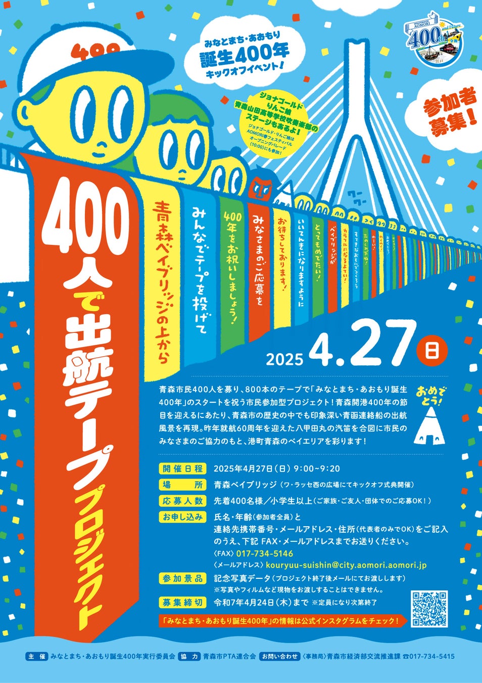 キックオフ宣言では、青森市民有志による「400人で出航テーププロジェクト」を開催。青森市の歴史の中でも印象深い青函連絡船の出航風景を再現し、港町青森のベイエリアを紙テープで彩ります!