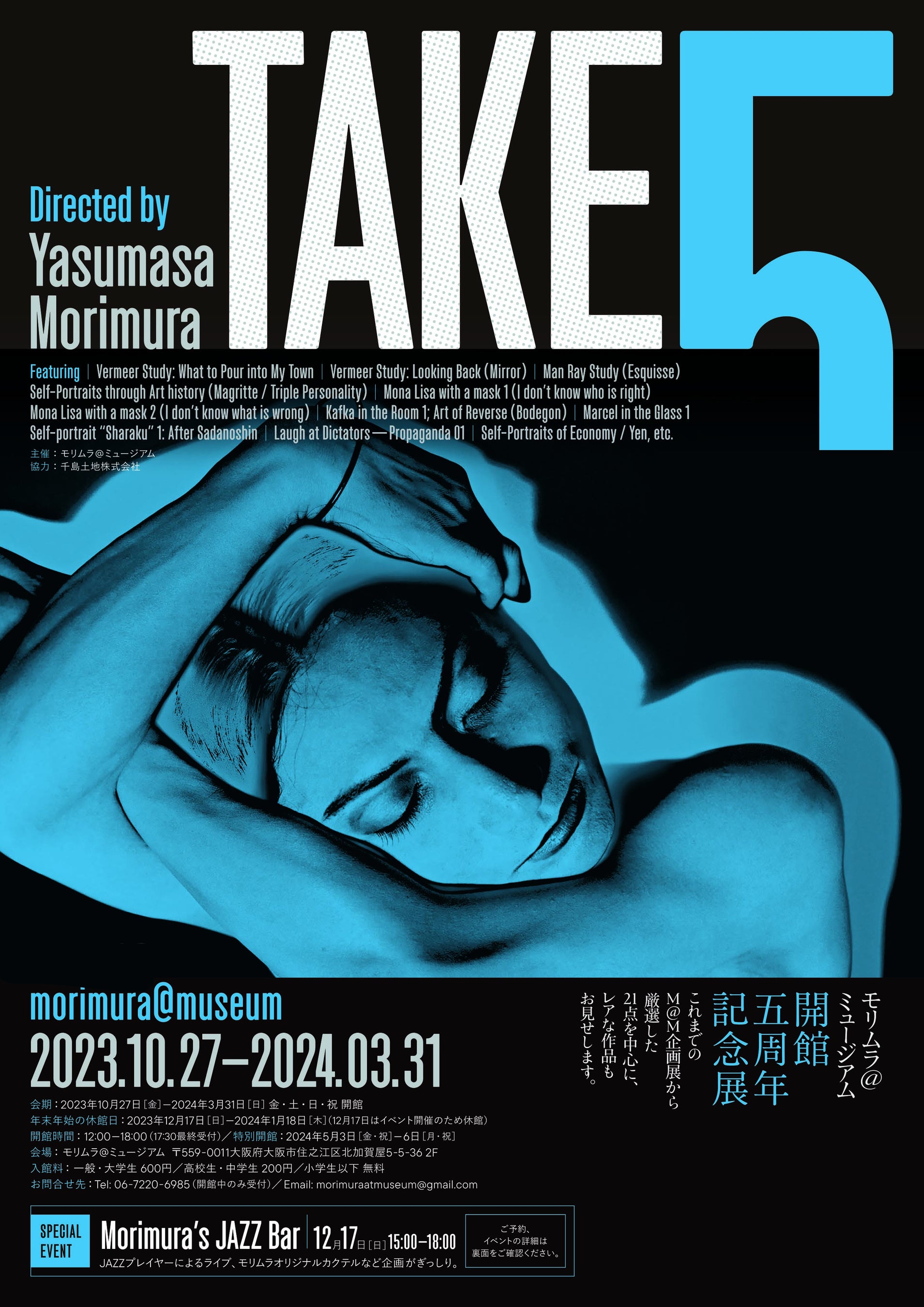 第9回企画展「TAKE5-モリムラ®ミュージアム開館5周年記念」を特別公開します。過去の企画展で展示された作品から厳選された21点を中心に、映像作品やMフォト(森村が撮影したプライベート写真)など、希少な作品を含む多彩な展示が行われます。過去を振り返りながらも、「フかくていなアしたをイきる ライブな展覧会」としての“テイク・ファイブ展”へお越しください。