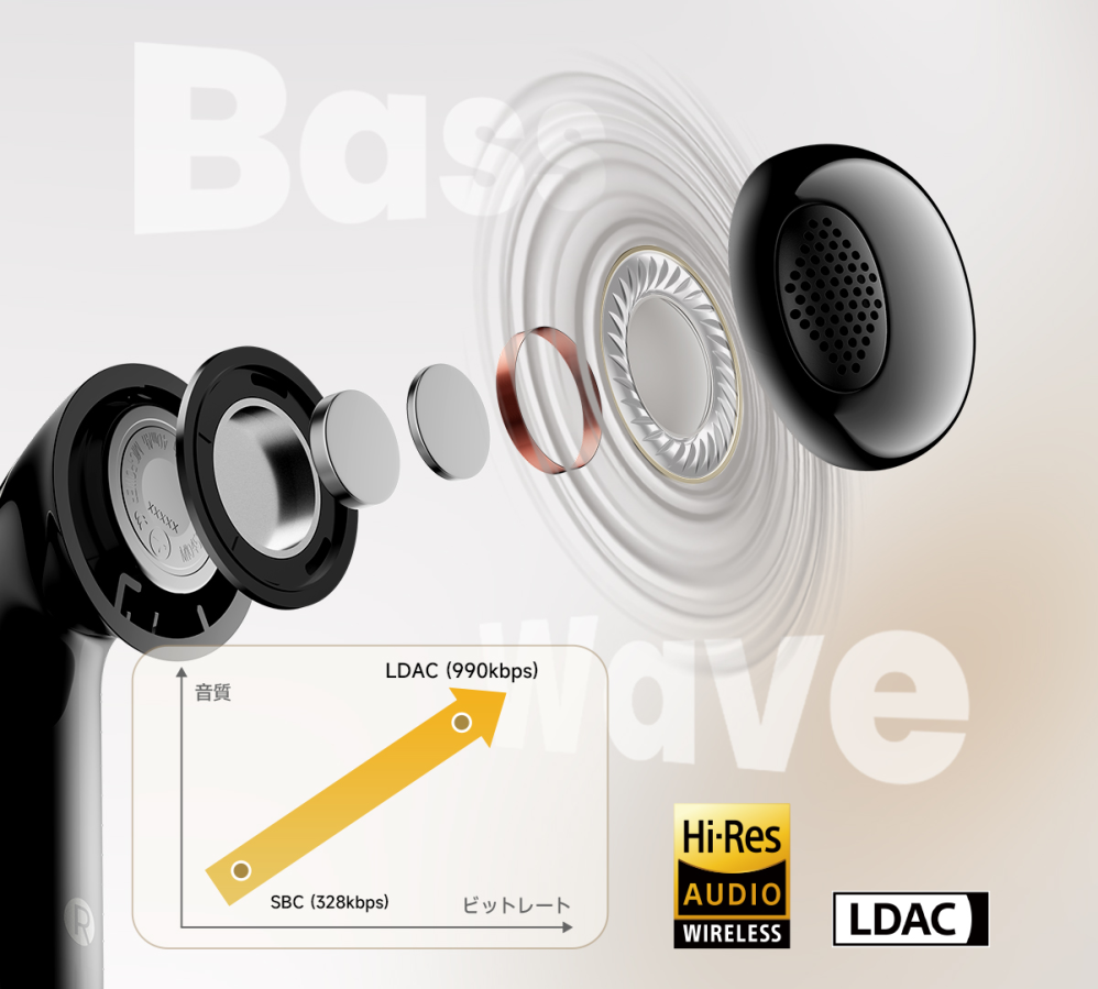 LDAC HDオーディオデコード(最大伝送速度990kbps)に対応し、40kHzフルバンドの高精度なハイレ ゾサウンドを実現。 自然で立体感のある音質と、快適な装着感による没入感あふれるリスニング体験を提供します。