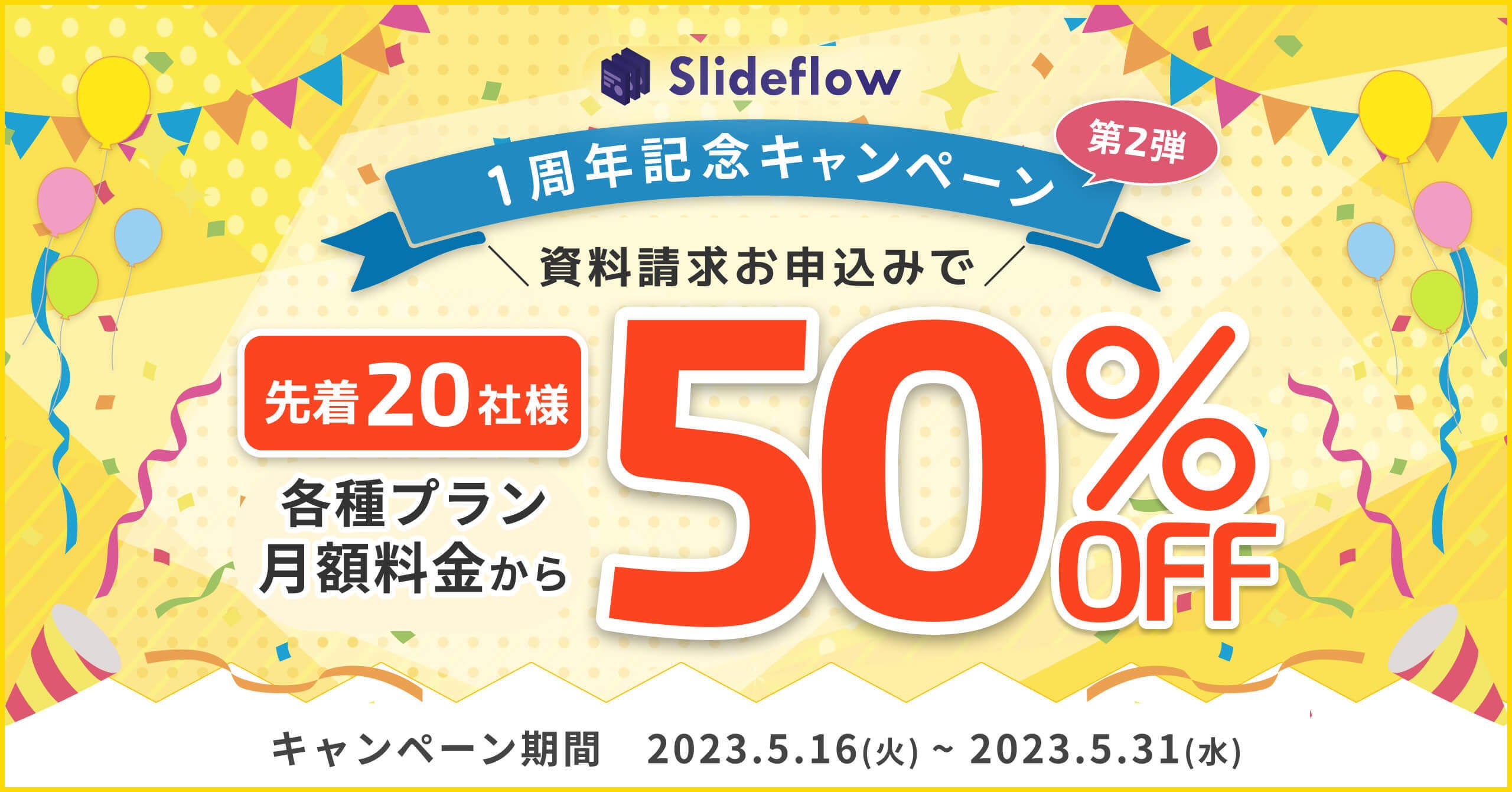 期間中にSlideflowキャンペーンサイトより資料請求をお申し込みいただくと、各種ご契約プランの月額料金が半年間50%OFFとなります。(先着20社さま限定)