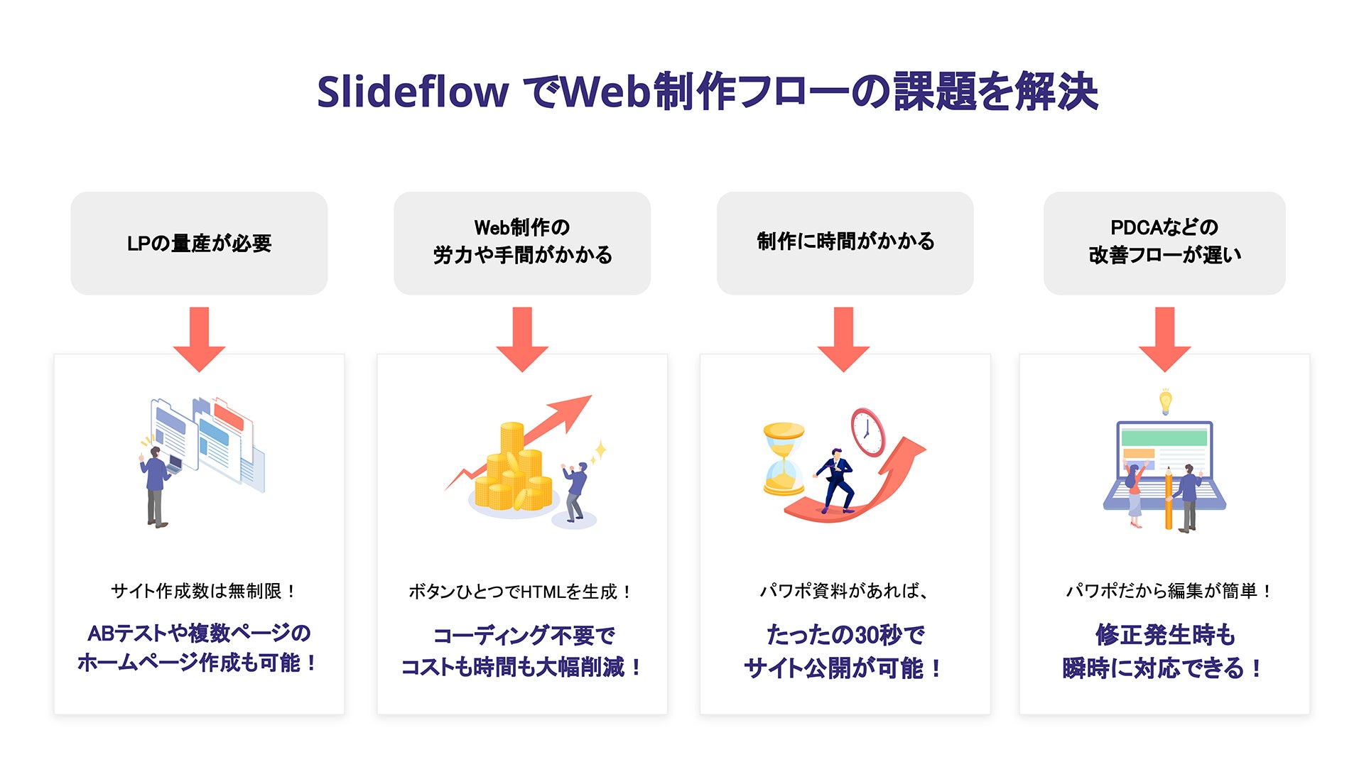 ▶︎このような企業の課題を、Slideflowを導入することで解決に導き、より効率的なWeb制作フローを実現できます。