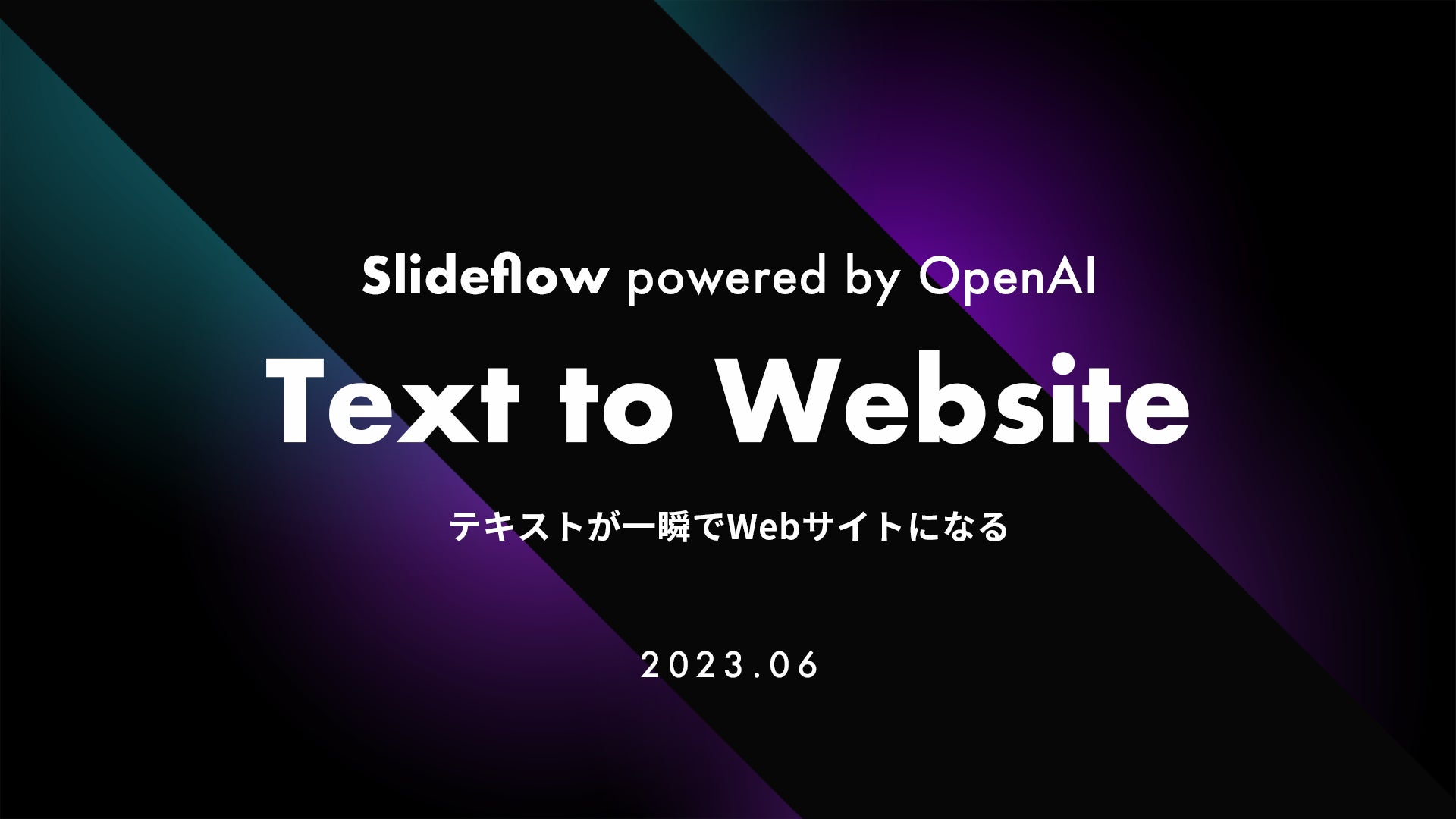 文字入力だけで瞬時にWEBサイトを制作できる、ChatGPT を搭載した新機能『Text to Website』を6月よりSlideflowにて提供開始いたします。Webサイトのデザイン選定やテキスト生成を生成AIが最短30秒で行い、WEBサイト制作時間・制作コストの大幅削減を実現できます。