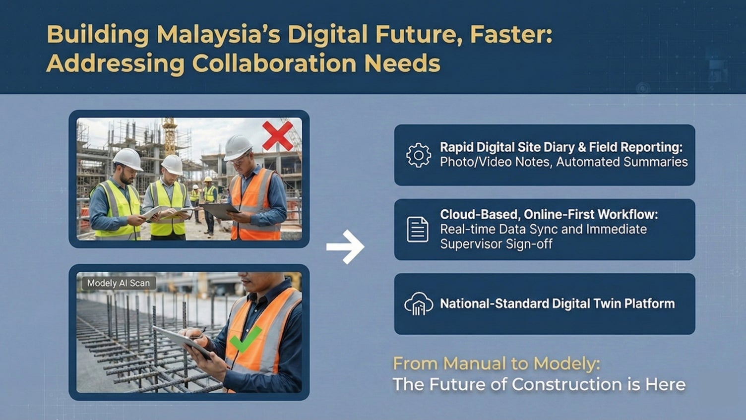 「Modely」は、iPad等のLiDARスキャンを活用し、配筋検査を効率化するシステムです。今回の提案では、現場の写真・動画付きメモ機能や自動サマリー作成による「現場日報の迅速化(Rapid Digital Site Diary)」、およびクラウド同期による「リアルタイムな管理者承認(Immediate Supervisor Sign-off)」を実現する点が、YTL社のニーズに合致しました。