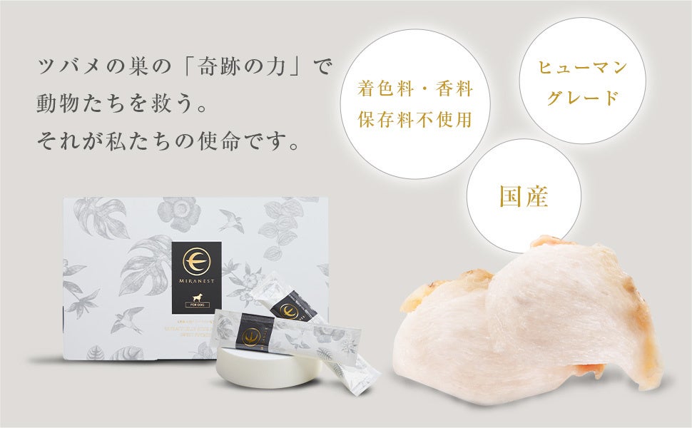 アナツバメの巣は古来より美容と健康に役立つ食材として用いられ、その中に含まれるシアル酸は様々な美容・健康効果が期待でき、それは動物も同様です。MIRANESTは、ツバメの巣の奇跡の力で、健康に悩みを持つ愛犬・愛猫を一匹でも多く救いたいという想いから、定期的にMIRANEST公式Instagramにて体験モニターを募集しています。