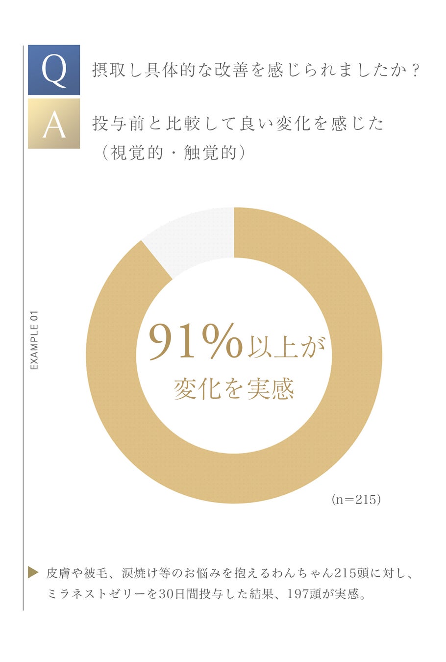 100%天然アナツバメの巣を高濃度抽出した「ミラネストゼリー FOR DOG」をお試しいただき、0日目、10日目、20日目、30日目のお写真とレポートにご協力いただける方に、1ヶ月サイズ(30本入り)を抽選で50名様にお送りいたします。